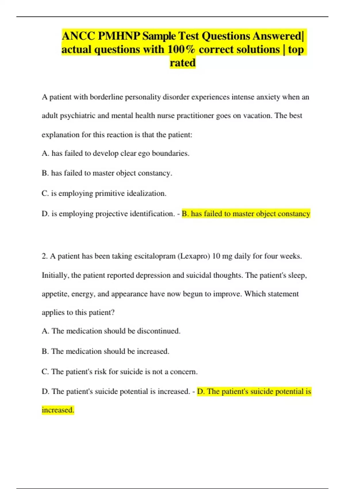 A patient with borderline personality disorder experiences intense anxiety when an adult psychiatric and mental health nurse practitioner goes on vacation. The best explanation for this reaction is that the patient: A. has failed to develop clear ego boundaries. B. has failed to master object constancy. C. is employing primitive idealization. D. is employing projective identification. - B. has failed to master object constancy 2. A patient has been taking escitalopram (Lexapro) 10 mg daily for four weeks. Initially, the patient reported depression and suicidal thoughts. The patient's sleep, appetite, energy, and appearance have now begun to improve. Which statement applies to this patient? A. The medication should be discontinued. B. The medication should be increased. C. The patient's risk for suicide is not a concern. D. The patient's suicide potential is increased. - D. The patient's suicide potential is increased.