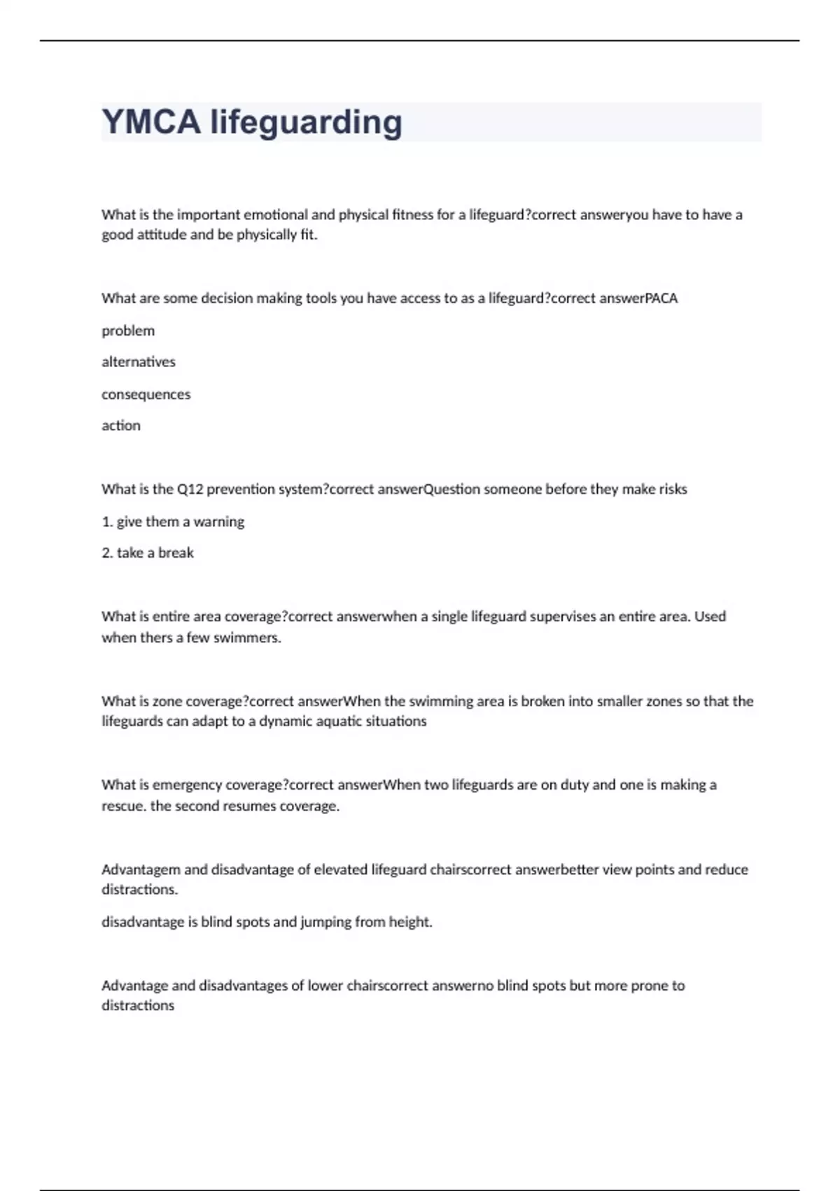 What is the important emotional and physical fitness for a lifeguard? you have to have a good attitude and be physically fit. What are some decision making tools you have access to as a lifeguard? PACA problem alternatives consequences action What is the Q12 prevention system? Question someone before they make risks 1. give them a warning 2. take a break What is entire area coverage? when a single lifeguard supervises an entire area. Used when thers a few swimmers. What is zone coverage? When the swimming area is broken into smaller zones so that the lifeguards can adapt to a dynamic aquatic situations What is emergency coverage? When two lifeguards are on duty and one is making a rescue. the second resumes coverage. Advantagem and disadvantage of elevated lifeguard chairs better view points and reduce distractions. disadvantage is blind spots and jumping from height. Advantage and disadvantages of lower chairs no blind spots but more prone to distractions Days that have day camps or special groups, what should you do to ensure the swimming ability of the patrons? give a swim test to anyone of concern What to do if patrons are deaf? give intrusctions with hands and no voice what to do if patrons are blind? use your voice and no hand signals Why rules necessary for aquatic facilitie? keeps the enviroment safe and enjoyable? Why is consistent enforcement of the rules important? so that nobody thinks their being unfairly treated What happens if you are disregarded as a lifeguard? summon the manager or assitant manager what are some high risk areas in pools? entrance, pool deck, obstructions on pool deck, ladders, pool gutters,lifelines, and the water