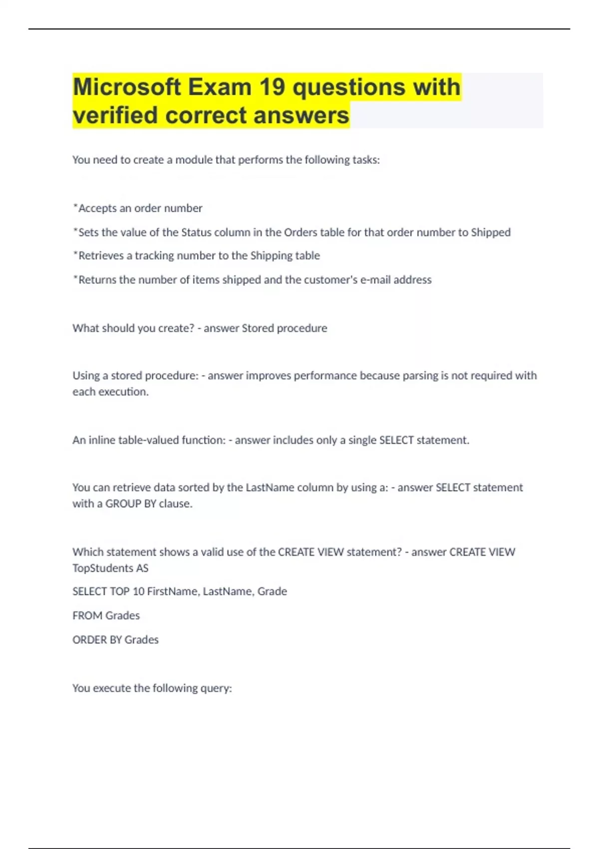 You need to create a module that performs the following tasks: *Accepts an order number *Sets the value of the Status column in the Orders table for that order number to Shipped *Retrieves a tracking number to the Shipping table *Returns the number of items shipped and the customer's e-mail address What should you create? Stored procedure Using a stored procedure: improves performance because parsing is not required with each execution. An inline table-valued function: includes only a single SELECT statement. You can retrieve data sorted by the LastName column by using a: SELECT statement with a GROUP BY clause. Which statement shows a valid use of the CREATE VIEW statement? CREATE VIEW TopStudents AS SELECT TOP 10 FirstName, LastName, Grade FROM Grades ORDER BY Grades You execute the following query: SELECT LoanNumber, OriginalLoanAmt, InterestRate FROM Loan WHERE BorrowerID IN (SELECT BorrowerID WHERE BorrowerState='TX') What is this an example of? a subquery What data structure physically stores the data in a relational database table that has a single nonclustered index? Heap You have created a view using the statement shown in the exhibit. You need to modify the view so that only movies with a rating of G or PG are visible through the view. What should you use? An ALTER VIEW statement with a WHERE clause At a minimum, what is required within a column definition a CREATE TABLE statement? A column name and data type You are creating a relational database that will store information about physicians and their patients. Each patient may have more than one physician. Each physician may have multiple patients. What should you include? Three tables and two one-to-many relationships What statement is a data definition language (DDL) statement? ALTER You are creating a relational database that will be used to track car rentals. Each renter can rent multiple cars. A car can be rented by multiple drivers. You need to reduce the amount of redundant data. How should you store the car rental data? Create a Cars table, a Renters table, and a CarRentals table. You are creating a view restricting the visible rows using a WHERE clause. You need to ensure that no changes made through the view cause the data to not conform to the view's WHERE clause condition. What should you do? Include WITH CHECK OPTION in your CREATE VIEW statement. You have a relational database that stores information about projects within your organization. You have a Project table and a ProjectManager table as shown in the exhibit. Why would you issue a DML statement? To add a new project when a new project is launched You are creating a table that has a column named Description. The Description column must store a string between 1 and 3500 characters in length. The Description column must support text written in multiple languages. Which data type will require the least amount of storage space? a subquery What is one reason to denormalize a database? nvarchar(3500) You have database that has the Employees table shown in the exhibit. The MangerID column has a foreign key constraint that references the EmployeeID column. The ManagerID column allows Nulls. You need to write a query that retrieves a two-column result set that shows the full names of the employees who report to each manager and the employees who do not have an assigned manager. Which join type should you use? To improve data retrieval performance The TRUNCATE TABLE statement: deletes all rows from the table, but does not log each row deleted. Your database includes the tables shown in the exhibit. You need to users to query the ProductID, StoreID, Description, and Price for only products at stores in California. Which statement should you