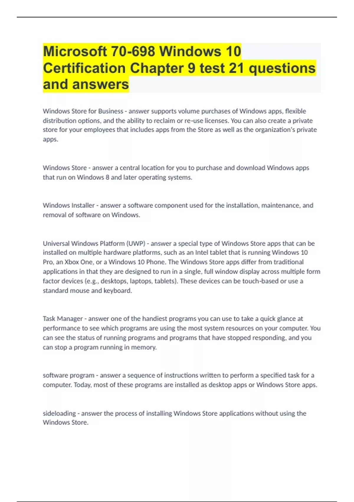 Windows Store for Business supports volume purchases of Windows apps, flexible distribution options, and the ability to reclaim or re‐use licenses. You can also create a private store for your employees that includes apps from the Store as well as the organization's private apps. Windows Store a central location for you to purchase and download Windows apps that run on Windows 8 and later operating systems. Windows Installer a software component used for the installation, maintenance, and removal of software on Windows. Universal Windows Platform (UWP) a special type of Windows Store apps that can be installed on multiple hardware platforms, such as an Intel tablet that is running Windows 10 Pro, an Xbox One, or a Windows 10 Phone. The Windows Store apps differ from traditional applications in that they are designed to run in a single, full window display across multiple form factor devices (e.g., desktops, laptops, tablets). These devices can be touch‐based or use a standard mouse and keyboard. Task Manager one of the handiest programs you can use to take a quick glance at performance to see which programs are using the most system resources on your computer. You can see the status of running programs and programs that have stopped responding, and you can stop a program running in memory. software program a sequence of instructions written to perform a specified task for a computer. Today, most of these programs are installed as desktop apps or Windows Store apps. sideloading the process of installing Windows Store applications without using the Windows Store. service a program, routine, or process that performs a specific system function to support other programs or to provide a network service. A service runs in the system background without a user interface. Some examples include World Wide Publishing services, Server services, Workstation services, and Windows Event Log services. provisioned apps When Windows apps are installed via a Windows image, they are called this Program Compatibility Troubleshooter a wizard‐based solution that users or administrators can use to automatically configure an executable file to use an appropriate Windows 10 compatibility mechanism. Thus, the troubleshooter is not a compatibility mechanism in itself; it is simply a method for applying other mechanisms. Microsoft account a unique account that is the combination of an email address and a password that you use to sign in to services like O MSN.com, H, OneDrive, Windows Phone, or Xbox Live. Line of Business (LOB) apps These apps include apps that are critical to running the company business as well as apps that are unique to the company's main business. desktop apps traditional apps, such as Microsoft Office or Adobe Acrobat. The applications are installed using an .exe or .msi installer file, which is obtained from a DVD, over a network from a shared folder, or over the Internet from the vendors' websites. deeplinking identifies an application in the Windows Store by providing a link that will take the user directly to the app in the Windows Store. Certificate Authority (CA) issues digital certificates that certify a person, organization, server, or computer is who it claims to be. Bring Your Own Device (BYOD) policies This policy defines the standards, restrictions, and procedures for end users who have authorized access to company data from their personal devices (tablet, laptop, smartphone). The policy also includes hardware and related software not approved, owned, or supplied by the company. In either case, as the administrator, you will need to make sure your strategy for accessing the Windows Store aligns with your company's policies.