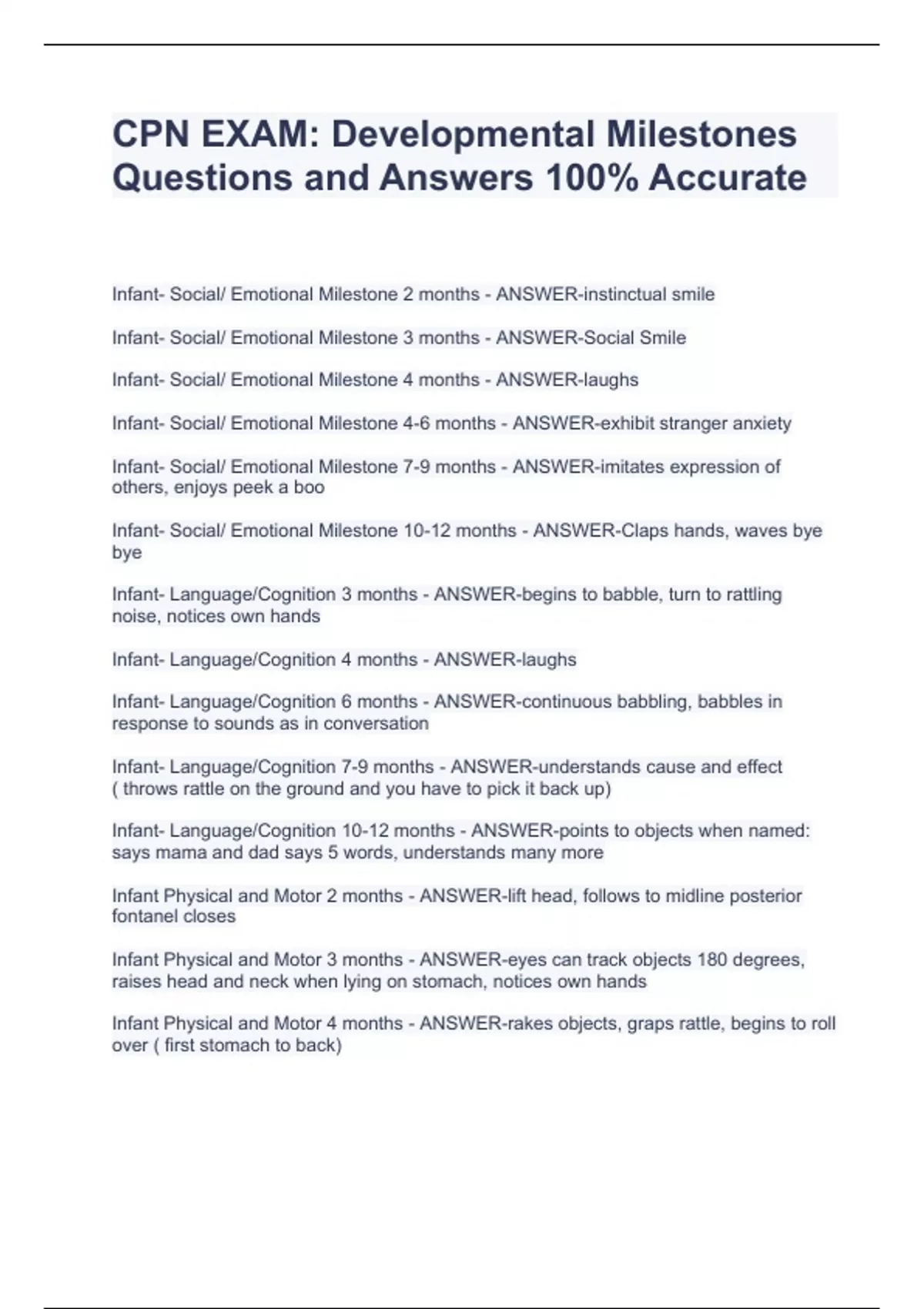 CPN EXAM: Developmental Milestones Questions and Answers 100% AccurateCPN EXAM: Developmental Milestones Questions and Answers 100% AccurateCPN EXAM: Developmental Milestones Questions and Answers 100% AccurateCPN EXAM: Developmental Milestones Questions and Answers 100% AccurateInfant- Social/ Emotional Milestone 2 months - ANSWER-instinctual smile Infant- Social/ Emotional Milestone 3 months - ANSWER-Social Smile Infant- Social/ Emotional Milestone 4 months - ANSWER-laughs Infant- Social/ Emotional Milestone 4-6 months - ANSWER-exhibit stranger anxiety Infant- Social/ Emotional Milestone 7-9 months - ANSWER-imitates expression of others, enjoys peek a boo Infant- Social/ Emotional Milestone 10-12 months - ANSWER-Claps hands, waves bye bye