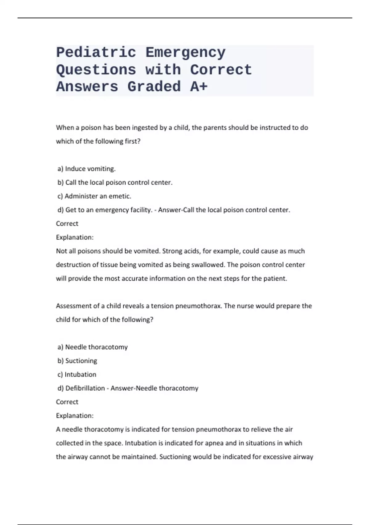 When a poison has been ingested by a child, the parents should be instructed to do which of the following first? a) Induce vomiting. b) Call the local poison control center. c) Administer an emetic. d) Get to an emergency facility. - Answer-Call the local poison control center. Correct Explanation: Not all poisons should be vomited. Strong acids, for example, could cause as much destruction of tissue being vomited as being swallowed. The poison control center will provide the most accurate information on the next steps for the patient. Assessment of a child reveals a tension pneumothorax. The nurse would prepare the child for which of the following? a) Needle thoracotomy b) Suctioning c) Intubation d) Defibrillation - Answer-Needle thoracotomy Correct Explanation: A needle thoracotomy is indicated for tension pneumothorax to relieve the air collected in the space. Intubation is indicated for apnea and in situations in which the airway cannot be maintained. Suctioning would be indicated for excessive airway secretions that influence airway patency. Defibrillation is used to stimulate or alter the heart's electrical rhythm. A 6-year-old girl who is being treated for shock is pulseless with an irregular heart rate of 32 BPM. Choose the priority intervention: a) Administer doses defibrillator shocks in a row b) Initiate cardiac compressions c) Give three doses of epinephrine d) Defibrillate once followed by three cycles of cardiopulmonary resuscitation (CPR) - Answer-Initiate cardiac compressions Correct Explanation: The American Heart Association (AHA) emphasizes the importance of cardiac compressions in pulseless clients with arrhythmias, making this the priority intervention in this situation. Current AHA recommendations are for defibrillation to be administered once followed by five cycles of CPR. The AHA now recommends against using multiple doses of epinephrine because they have not been shown to be helpful and may actually cause harm to the child. A 3-year-old girl had a near-drowning incident when she fell into a wading pool. Which intervention would be of the highest priority? a) Inserting a nasogastric tube to decompress stomach b) Assuring the child stays still during an X-ray c) Suctioning the upper airway to ensure airway patency d) Covering the child with warming blankets - Answer-Suctioning the upper airway to ensure airway patency Correct Explanation: Due to the potentially devastating effects of drowning-related hypoxia on a child's brain, airway interventions must be initiated immediately. The child's airway should be suctioned to ensure patency. Other interventions such as covering the child with blankets, inserting a nasogastric tube, and assuring that the child remains still during X-ray are interventions that are appropriate once airway patency is achieved and maintained