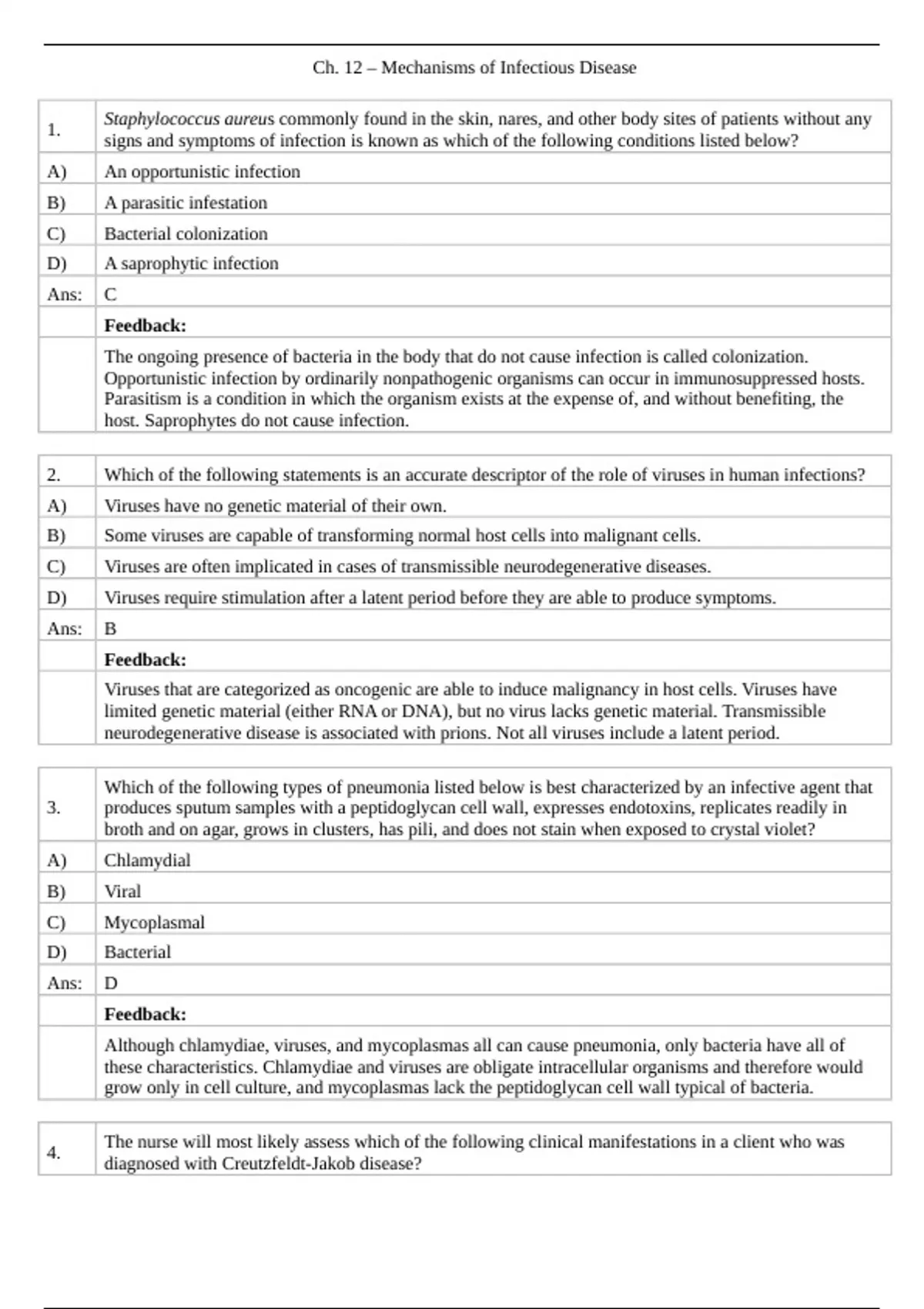 h. 12 – Mechanisms of Infectious Disease 1. Staphylococcus aureus commonly found in the skin, nares, and other body sites of patients without any signs and symptoms of infection is known as which of the following conditions listed below? A) An opportunistic infection B) A parasitic infestation C) Bacterial colonization D) A saprophytic infection Ans: C Feedback: The ongoing presence of bacteria in the body that do not cause infection is called colonization. Opportunistic infection by ordinarily nonpathogenic organisms can occur in immunosuppressed hosts. Parasitism is a condition in which the organism exists at the expense of, and without benefiting, the host. Saprophytes do not cause infection. 2. Which of the following statements is an accurate descriptor of the role of viruses in human infections? A) Viruses have no genetic material of their own. B) Some viruses are capable of transforming normal host cells into malignant cells. C) Viruses are often implicated in cases of transmissible neurodegenerative diseases. D) Viruses require stimulation after a latent period before they are able to produce symptoms. Ans: B Feedback: Viruses that are categorized as oncogenic are able to induce malignancy in host cells. Viruses have limited genetic material (either RNA or DNA), but no virus lacks genetic material. Transmissible neurodegenerative disease is associated with prions. Not all viruses include a latent period. 3. Which of the following types of pneumonia listed below is best characterized by an infective agent that produces sputum samples with a peptidoglycan cell wall, expresses endotoxins, replicates readily in broth and on agar, grows in clusters, has pili, and does not stain when exposed to crystal violet? A) Chlamydial B) Viral C) Mycoplasmal D) Bacterial Ans: D Feedback: Although chlamydiae, viruses, and mycoplasmas all can cause pneumonia, only bacteria have all of these characteristics. Chlamydiae and viruses are obligate intracellular organisms and therefore would grow only in cell culture, and mycoplasmas lack the peptidoglycan cell wall typical of bacteria. 4. The nurse will most likely assess which of the following clinical manifestations in a client who was diagnosed with Creutzfeldt-Jakob disease?