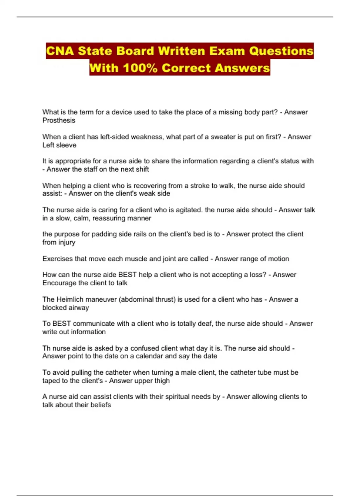 CNA State Board Written Exam Questions With 100% Correct Answers