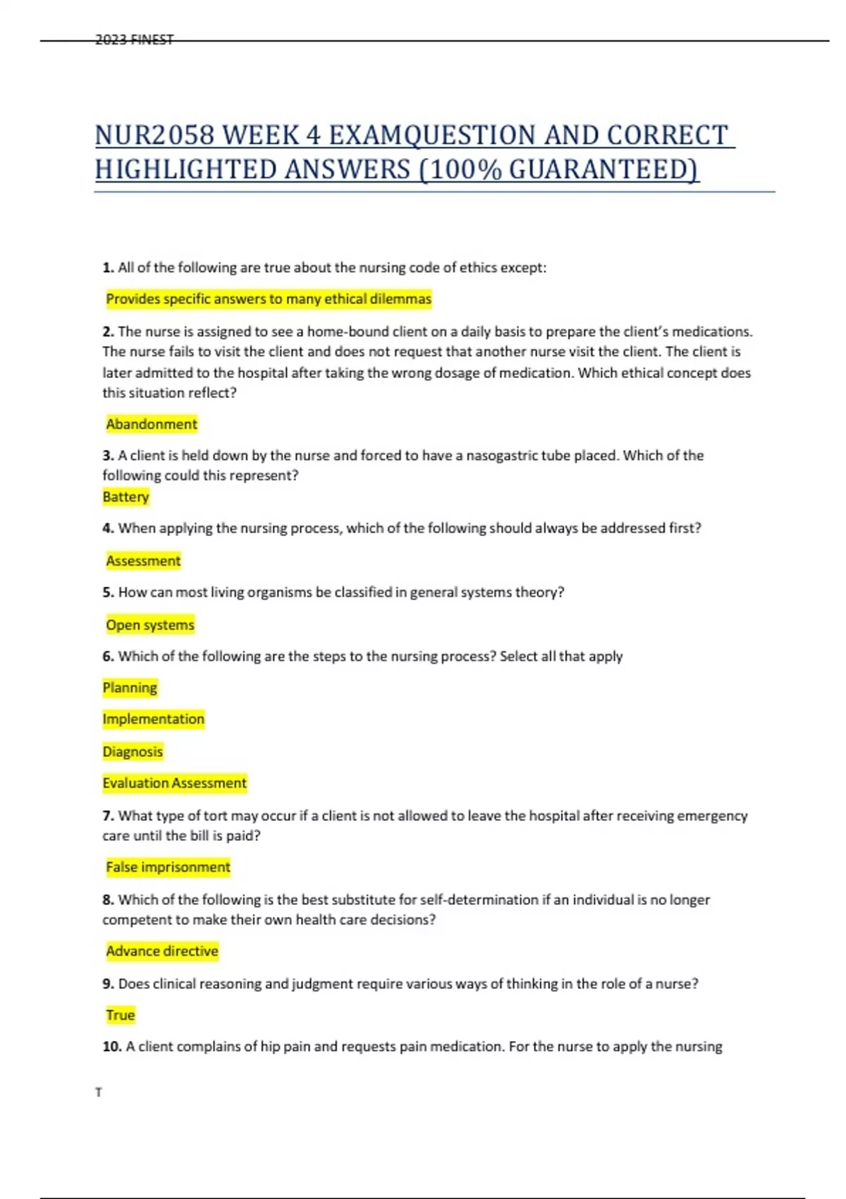 NUR2058 WEEK 4 EXAMQUESTION AND CORRECT HIGHLIGHTED ANSWERS (100% GUARANTEED)