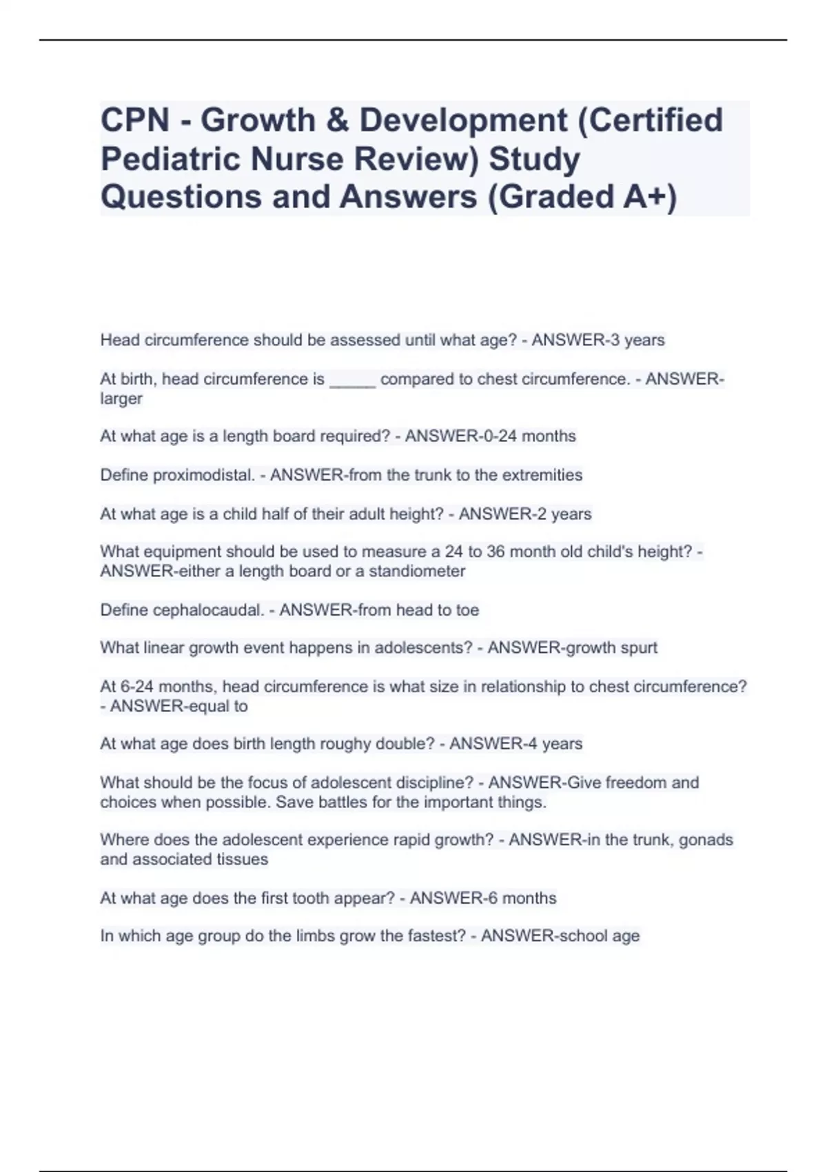 CPN - Growth & Development (Certified Pediatric Nurse Review) Study Questions and Answers (Graded A+)