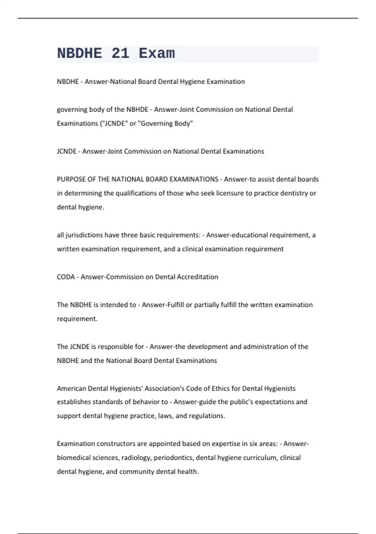 NBDHE - Answer-National Board Dental Hygiene Examination governing body of the NBHDE - Answer-Joint Commission on National Dental Examinations ("JCNDE" or "Governing Body" JCNDE - Answer-Joint Commission on National Dental Examinations PURPOSE OF THE NATIONAL BOARD EXAMINATIONS - Answer-to assist dental boards in determining the qualifications of those who seek licensure to practice dentistry or dental hygiene. all jurisdictions have three basic requirements: - Answer-educational requirement, a written examination requirement, and a clinical examination requirement CODA - Answer-Commission on Dental Accreditation The NBDHE is intended to - Answer-Fulfill or partially fulfill the written examination requirement. The JCNDE is responsible for - Answer-the development and administration of the NBDHE and the National Board Dental Examinations American Dental Hygienists' Association's Code of Ethics for Dental Hygienists establishes standards of behavior to - Answer-guide the public's expectations and support dental hygiene practice, laws, and regulations. Examination constructors are appointed based on expertise in six areas: - Answer- biomedical sciences, radiology, periodontics, dental hygiene curriculum, clinical dental hygiene, and community dental health.