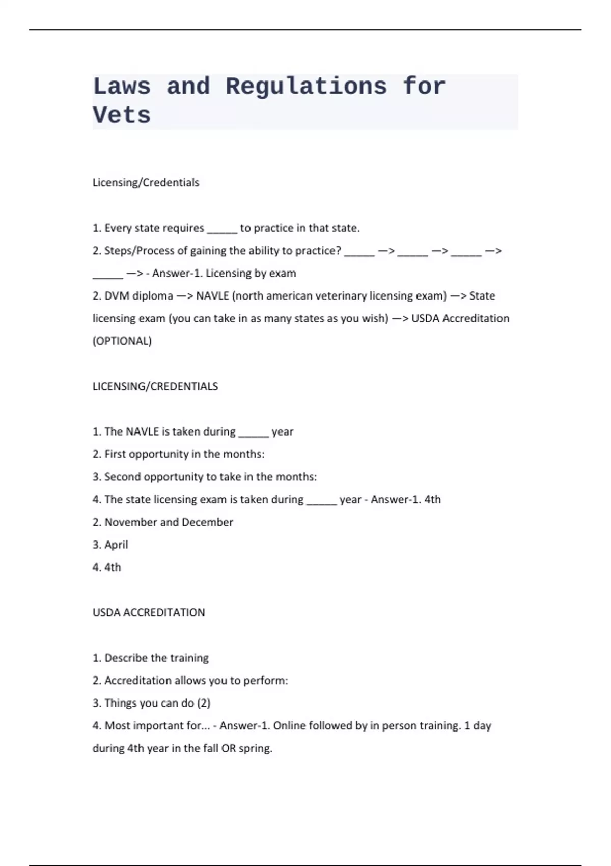 Licensing/Credentials 1. Every state requires _____ to practice in that state. 2. Steps/Process of gaining the ability to practice? _____ —> _____ —> _____ —> _____ —> - Answer-1. Licensing by exam 2. DVM diploma —> NAVLE (north american veterinary licensing exam) —> State licensing exam (you can take in as many states as you wish) —> USDA Accreditation (OPTIONAL) LICENSING/CREDENTIALS 1. The NAVLE is taken during _____ year 2. First opportunity in the months: 3. Second opportunity to take in the months: 4. The state licensing exam is taken during _____ year - Answer-1. 4th 2. November and December 3. April 4. 4th USDA ACCREDITATION 1. Describe the training 2. Accreditation allows you to perform: 3. Things you can do (2) 4. Most important for... - Answer-1. Online followed by in person training. 1 day during 4th year in the fall OR spring. 2. Regulatory services overseen by USDA Animal and Plant Health Inspection Service (APHIS) 3. Testing for program diseases (brucellosis, tuberculosis) ; issue certifications of veterinary inspection (CVI) and health certificates ; 4. Those in food animal and/or equine practice ADMINISTRATION OF RABIES VACCINE 1. Oklahoma 2. Texas 3. States requiring USDA accreditation to give rabies vaccine? - Answer-1. Can only be given by a licensed veterinarian or RVT under general supervision of a licensed veterinarian. 2. Only given by license vet or non-vet under direct supervision and with a valid VCPR. 3. Indiana, Ohio, South Dakota 1. Every state has a _____ _____ Act and a Board of _____ _____. 2. Always read your _____ 3. Updated on a _____ - Answer-Veterinary Practice ; Veterinary Examiners 2. State practice act 3. Regular basis TELEMEDICINE 1. A means of ... 2. Veterinarian must have had access to and reviewed.... 3. Does NOT include.... 4. Vet must take appropriate steps to _____ and conduct all appropriate evaluations and history of the patient consistent with _____ for the particular patient presentation. 5. The vet must be licensed (under the jurisdiction of) ... - Answer-1. 2-way, real time interactive communication between a client and veterinarian.