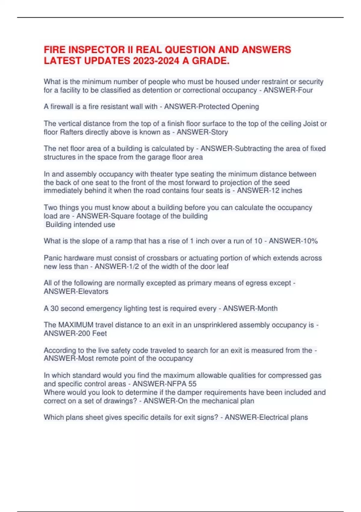 FIRE INSPECTOR II REAL QUESTION AND ANSWERS LATEST UPDATES A GRADE.