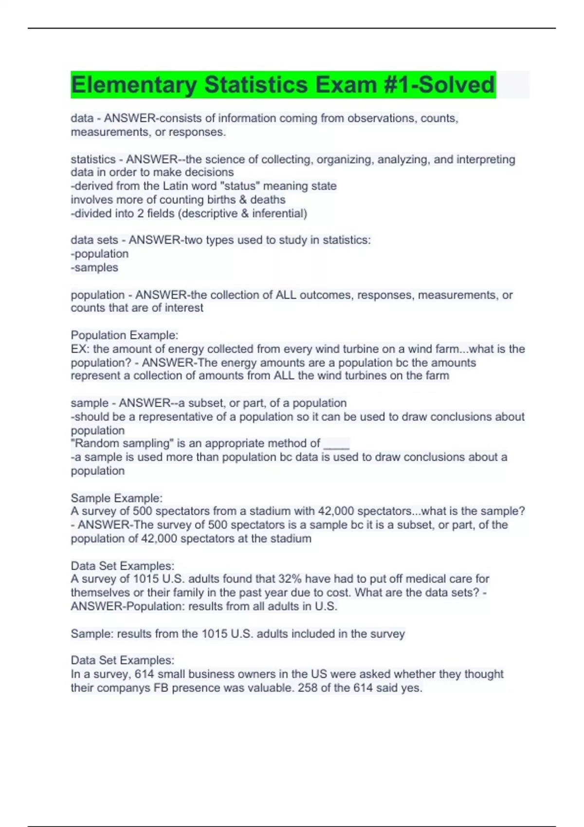data - ANSWER-consists of information coming from observations, counts, measurements, or responses. statistics - ANSWER--the science of collecting, organizing, analyzing, and interpreting data in order to make decisions -derived from the Latin word "status" meaning state involves more of counting births & deaths -divided into 2 fields (descriptive & inferential) data sets - ANSWER-two types used to study in statistics: -population -samples population - ANSWER-the collection of ALL outcomes, responses, measurements, or counts that are of interest Population Example: EX: the amount of energy collected from every wind turbine on a wind farm...what is the population? - ANSWER-The energy amounts are a population bc the amounts represent a collection of amounts from ALL the wind turbines on the farm sample - ANSWER--a subset, or part, of a population -should be a representative of a population so it can be used to draw conclusions about population "Random sampling" is an appropriate method of ____ -a sample is used more than population bc data is used to draw conclusions about a population Sample Example: A survey of 500 spectators from a stadium with 42,000 spectators...what is the sample? - ANSWER-The survey of 500 spectators is a sample bc it is a subset, or part, of the population of 42,000 spectators at the stadium Data Set Examples: A survey of 1015 U.S. adults found that 32% have had to put off medical care for themselves or their family in the past year due to cost. What are the data sets? - ANSWER-Population: results from all adults in U.S. Sample: results from the 1015 U.S. adults included in the survey Data Set Examples: In a survey, 614 small business owners in the US were asked whether they thought their companys FB presence was valuable. 258 of the 614 said yes. What is the population and sample & describe the sample data set? - ANSWER-The population consists of the responses of all small business owners in the US. The sample consists of the 614 responses of the small business owners in the survey. **The sample is a subset of responses of business owners in the US...the sample data set consists of 258 "yes" owners & 356 owners who said "no" parameter - ANSWER-a numerical description of a POPULATION characteristic Parameter Example: In January 2013, 60% of the governors of the 50 states in the USA were republicans. What is the Parameter? - ANSWER-The 60% is the PARAMETER. It is the numerical description of the total number of governors statistic - ANSWER-a numerical description of a SAMPLE characteristic Statistic Example: The average annual salary for 35 of a company's 1200 accountants is $68,000. What is the Statistic? - ANSWER-The $68,000 is a STATISTIC. It is a numerical description of a sample of annual salaries Descriptive Statistics - ANSWER-is a branch of statistics that involves organization, summarization, and display of data. Descriptive Stats Example: A survey of 202 pilots found that 20% admit that they have made a serious error due to sleepiness. What is the descriptive statistic? - ANSWER-The statement "20% admit that they have made serious errors due to sleepiness" is a descriptive statistic. Inferential Statistics - ANSWER-is the branch of statistics that involves using a sample to draw conclusions about a population. A basic tool in the study of this is probability. Inferential Statistics Example: An inference is drawn from the sample is that "an association exists between sleepiness and pilot error." - ANSWER-Making this inference is an example of inferential stats qualitative - ANSWER-attributes, lables, or nonnumerical entries EX: eye colors of models since eye color is a nonnumerical attribute quantitative (N) - ANSWER-numerical measurements or counts EX: heights of hot air balloons census - ANSWER-is a count or measure of an entire population & provides complete information