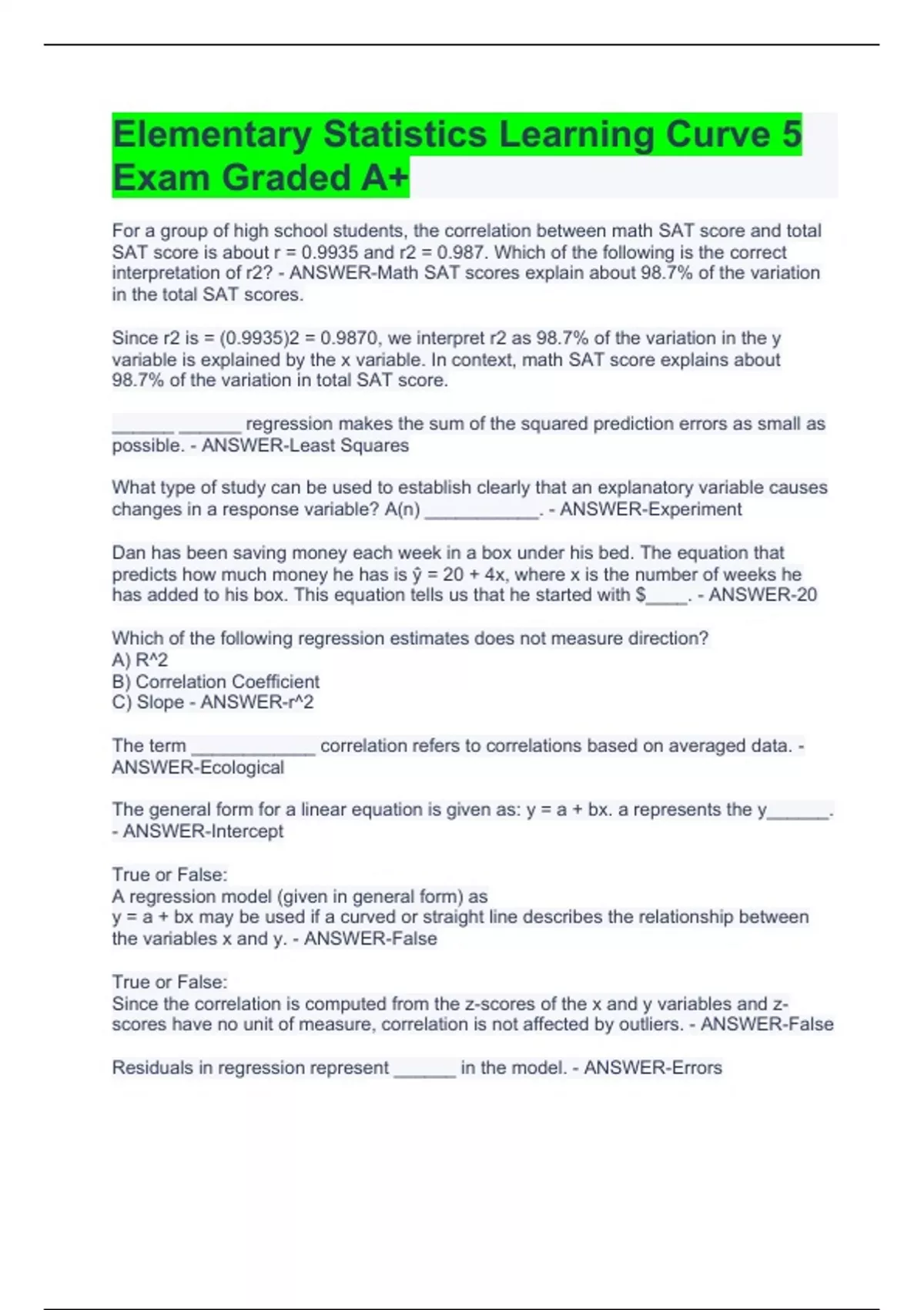 For a group of high school students, the correlation between math SAT score and total SAT score is about r = 0.9935 and r2 = 0.987. Which of the following is the correct interpretation of r2? - ANSWER-Math SAT scores explain about 98.7% of the variation in the total SAT scores. Since r2 is = (0.9935)2 = 0.9870, we interpret r2 as 98.7% of the variation in the y variable is explained by the x variable. In context, math SAT score explains about 98.7% of the variation in total SAT score. ______ ______ regression makes the sum of the squared prediction errors as small as possible. - ANSWER-Least Squares What type of study can be used to establish clearly that an explanatory variable causes changes in a response variable? A(n) ___________. - ANSWER-Experiment Dan has been saving money each week in a box under his bed. The equation that predicts how much money he has is ŷ = 20 + 4x, where x is the number of weeks he has added to his box. This equation tells us that he started with $____. - ANSWER-20 Which of the following regression estimates does not measure direction? A) R^2 B) Correlation Coefficient C) Slope - ANSWER-r^2 The term ____________ correlation refers to correlations based on averaged data. - ANSWER-Ecological The general form for a linear equation is given as: y = a + bx. a represents the y______. - ANSWER-Intercept True or False: A regression model (given in general form) as y = a + bx may be used if a curved or straight line describes the relationship between the variables x and y. - ANSWER-False True or False: Since the correlation is computed from the z-scores of the x and y variables and z-scores have no unit of measure, correlation is not affected by outliers. - ANSWER-False Residuals in regression represent ______ in the model. - ANSWER-Errors