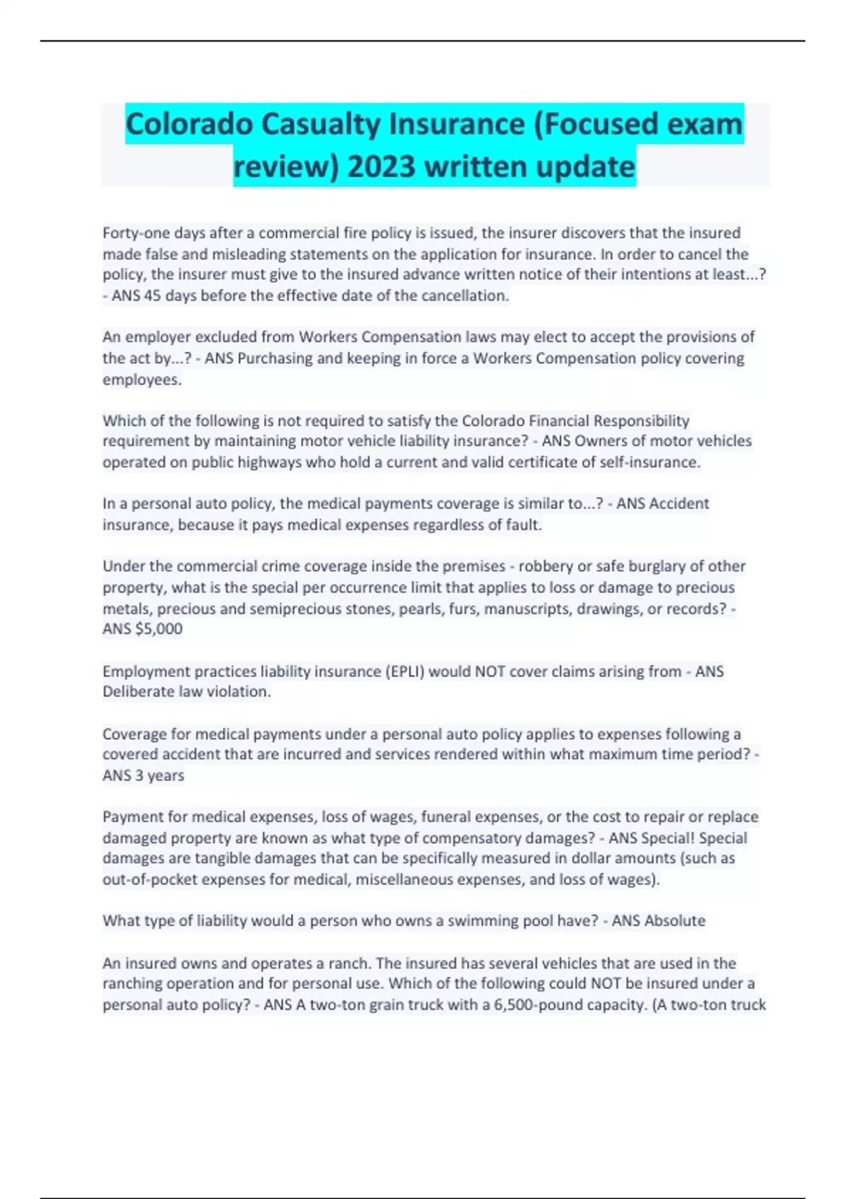 Colorado Casualty Insurance (Focused exam review) 2023 written update