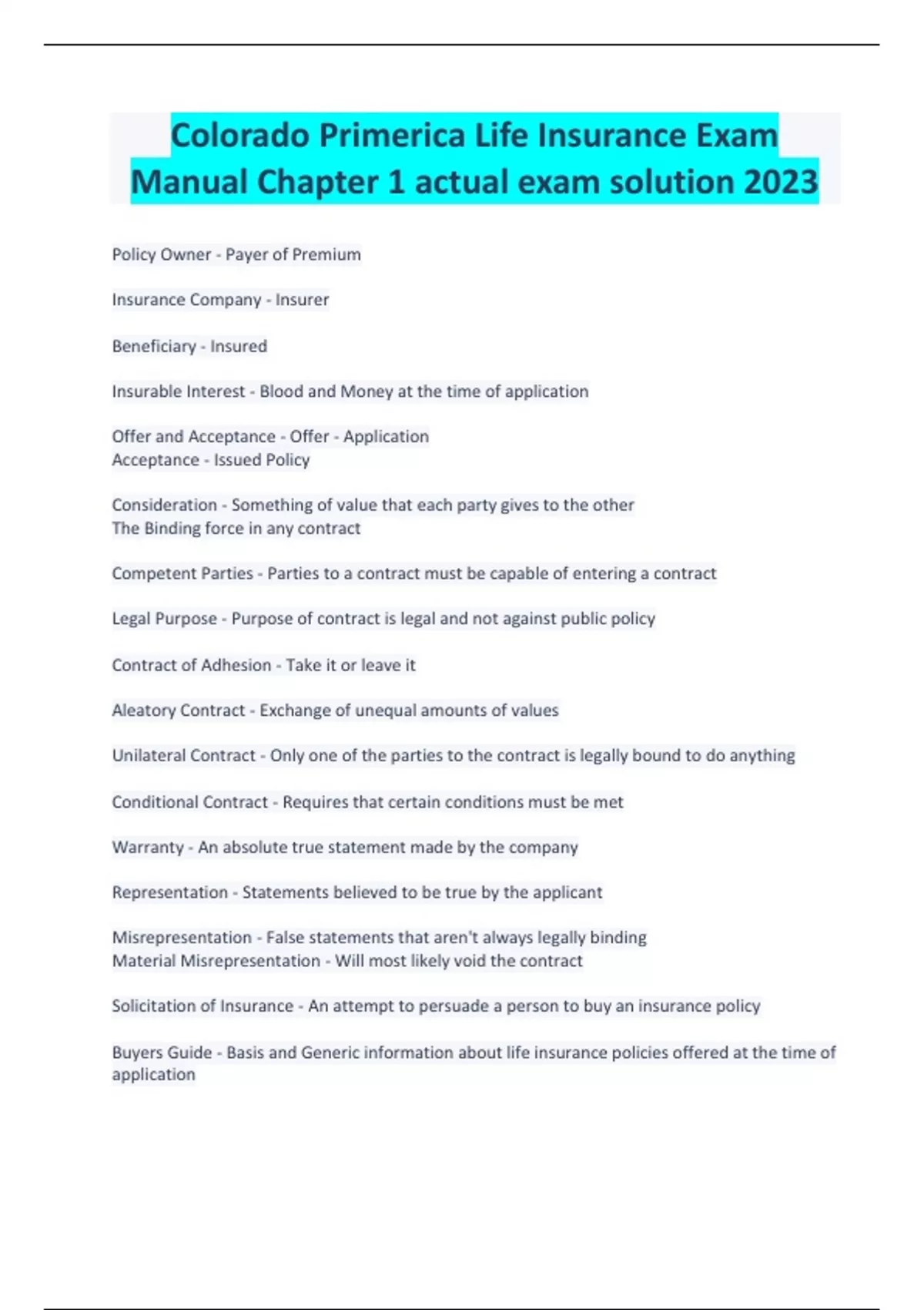 Colorado Primerica Life Insurance Exam Manual Chapter 1 actual exam solution 2023