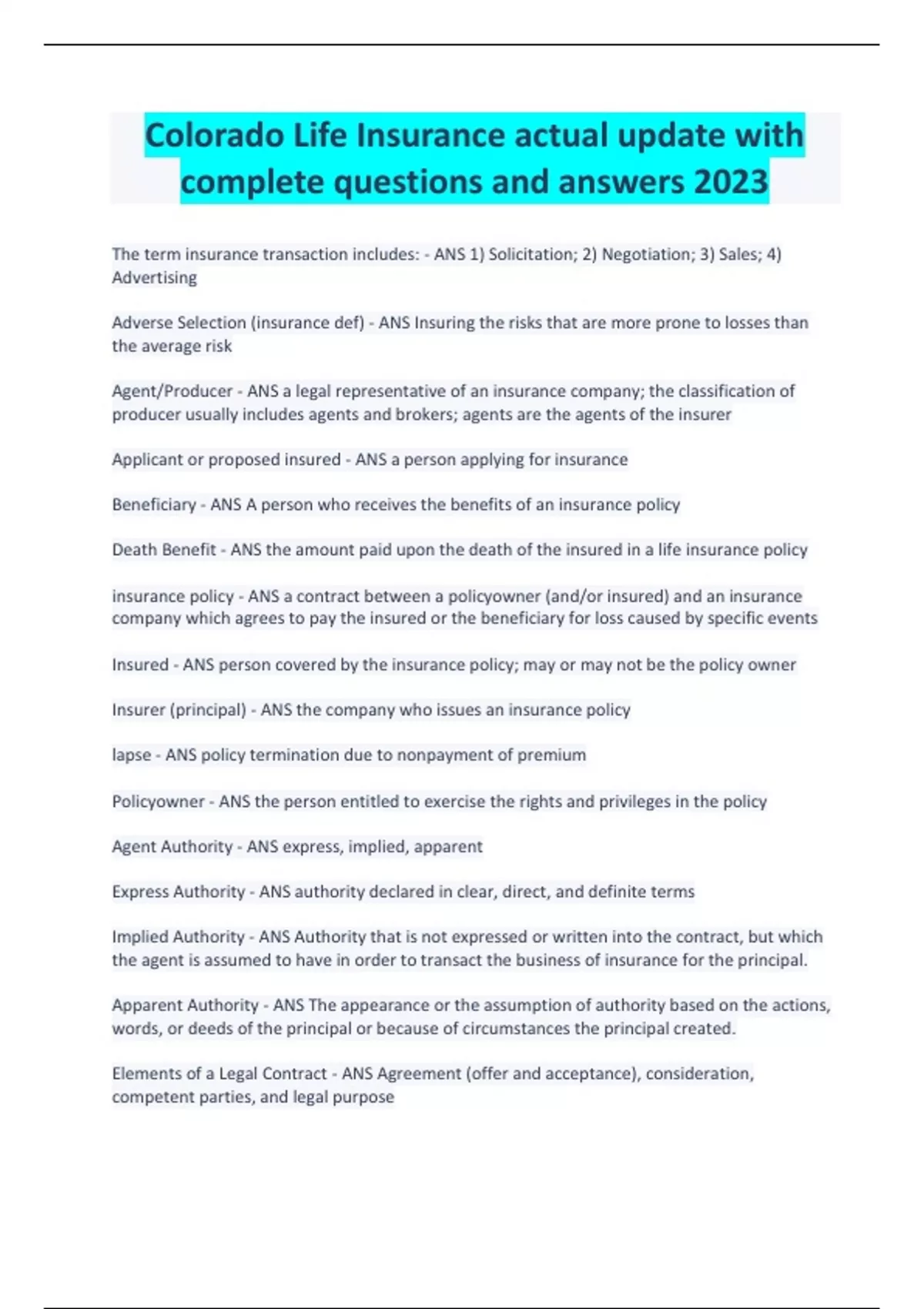 Colorado Life Insurance actual update with complete questions and answers 2023
