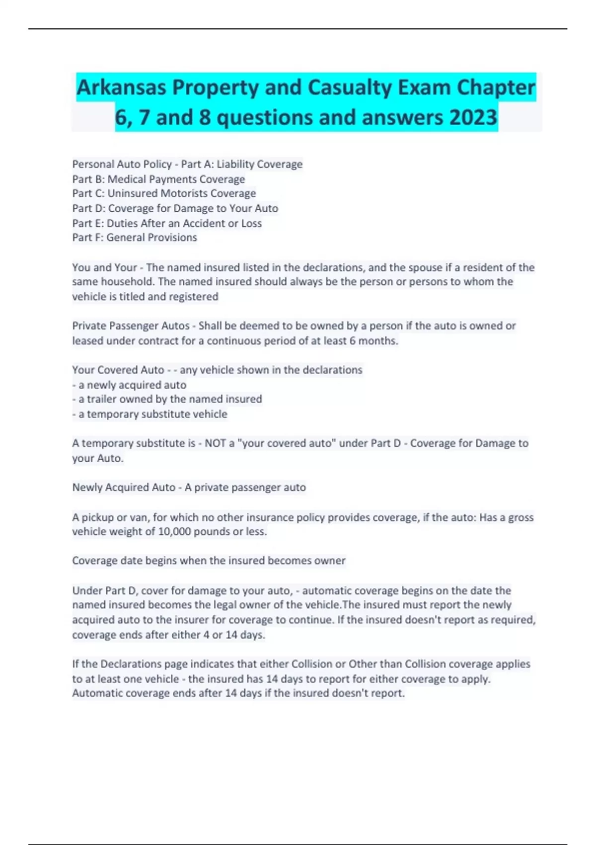 Arkansas Property and Casualty Exam Chapter 6, 7 and 8 questions and answers 2023