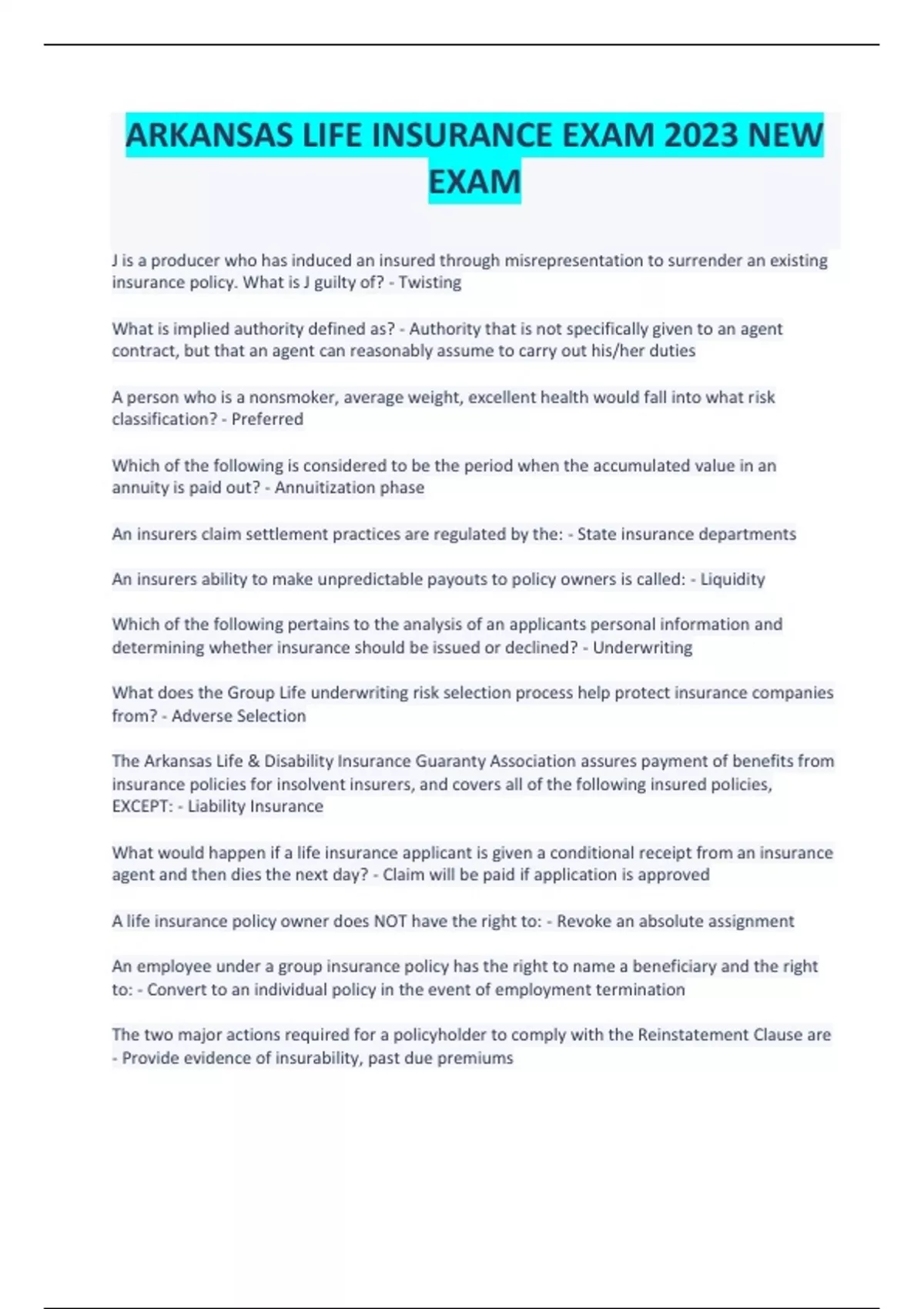 ARKANSAS LIFE INSURANCE EXAM 2023 NEW EXAM
