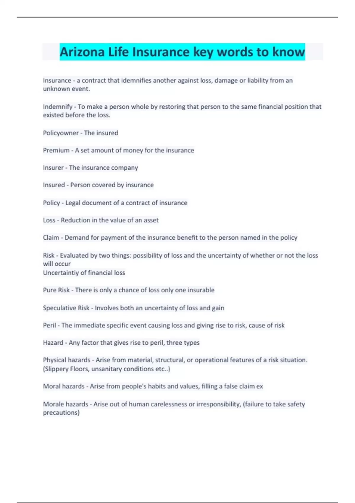 Arizona Life Insurance key words to know