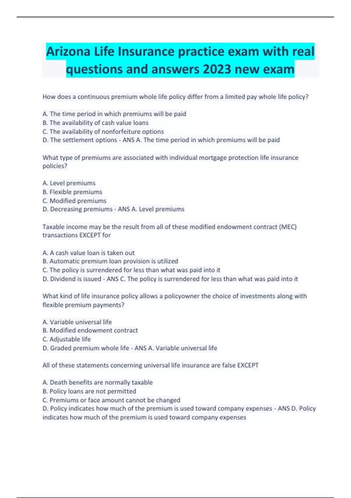 Arizona Life Insurance practice exam with real questions and answers 2023 new exam