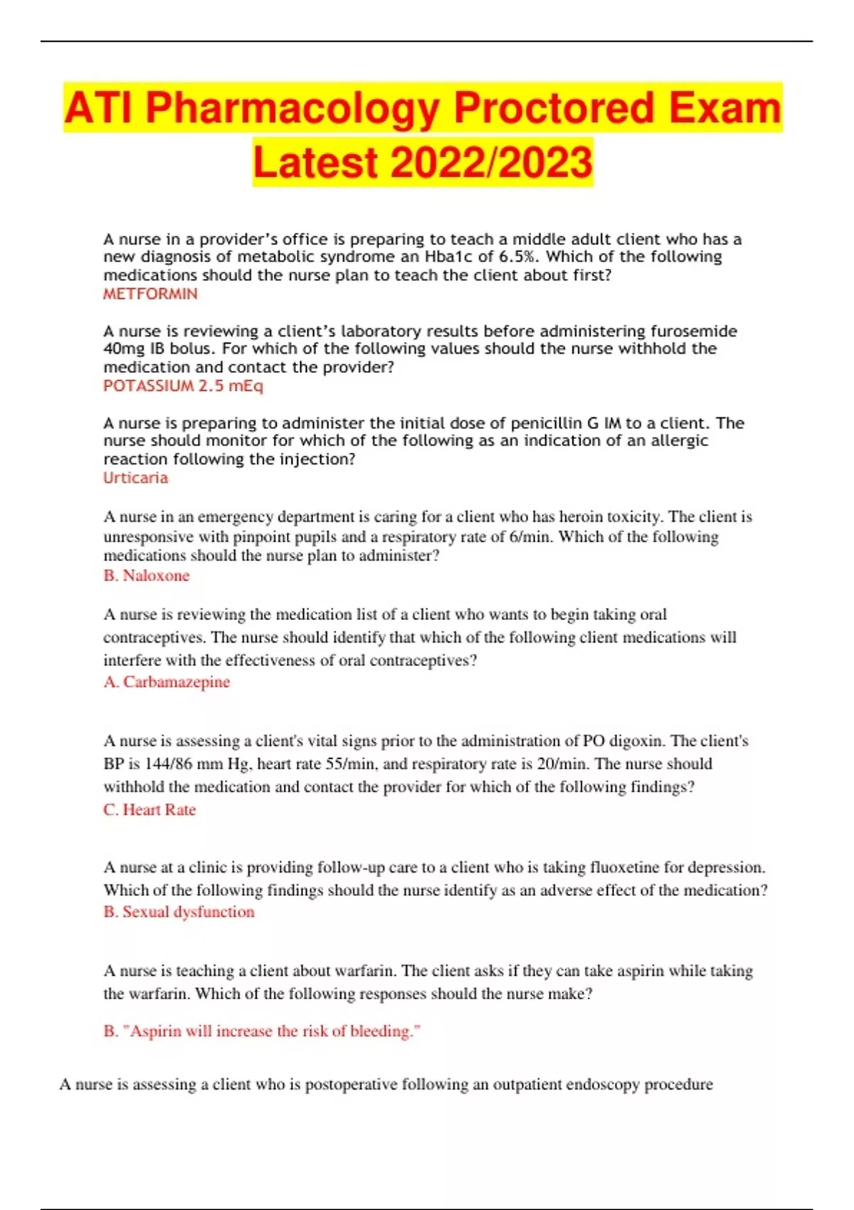 ATI Pharmacology Proctored Exam Latest 2022/2023 A nurse in a provider’s office is preparing to teach a middle adult client who has a new diagnosis of metabolic syndrome an Hba1c of 6.5%. Which of the following medications should the nurse plan to teach the client about first? METFORMIN A nurse is reviewing a client’s laboratory results before administering furosemide 40mg IB bolus. For which of the following values should the nurse withhold the medication and contact the provider? POTASSIUM 2.5 mEq A nurse is preparing to administer the initial dose of penicillin G IM to a client. The nurse should monitor for which of the following as an indication of an allergic reaction following the injection? Urticaria A nurse in an emergency department is caring for a client who has heroin toxicity. The client is unresponsive with pinpoint pupils and a respiratory rate of 6/min. Which of the following medications should the nurse plan to administer? B. Naloxone A nurse is reviewing the medication list of a client who wants to begin taking oral contraceptives. The nurse should identify that which of the following client medications will interfere with the effectiveness of oral contraceptives? A. Carbamazepine A nurse is assessing a client's vital signs prior to the administration of PO digoxin. The client's BP is 144/86 mm Hg, heart rate 55/min, and respiratory rate is 20/min. The nurse should withhold the medication and contact the provider for which of the following findings? C. Heart Rate A nurse at a clinic is providing follow-up care to a client who is taking fluoxetine for depression. Which of the following findings should the nurse identify as an adverse effect of the medication? B. Sexual dysfunction A nurse is teaching a client about warfarin. The client asks if they can take aspirin while taking the warfarin. Which of the following responses should the nurse make? B. "Aspirin will increase the risk of bleeding." A nurse is assessing a client who is postoperative following an outpatient endoscopy procedure using midazolam. The nurse should monitor for which of the following findings as an indication that the client is ready for discharge? A. The client's capnography has returned to baseline A nurse is caring for the parent of a newborn. The parent asks the nurse when their newborn should receive the first diptheria, tetanus, and pertussis vaccine (DTaP). The nurse should instruct the parent that their newborn should receive the immunization at which of the following ages? B. 2 months A nurse is caring for a client who received 0.9% sodium chloride 1 L over 4 hr instead of over 8 hr as prescribed. Which of the following information should the nurse enter as a complete documentation of the incident? A. IV fluid infused over 4 hr instead of the prescribed 8 hr. Client tolerated fluids well, provider notified A nurse is assessing a client who is taking propylthiouracil for the treatment of Graves' disease. Which of the following findings should the nurse identify as an indication that the medication has been effective? D. Increase in ability to focus A nurse is preparing to administer medications to a client who tells the nurse, "I don't want to take my fluid pill until I get home today." Which of the following actions should the nurse take? A. Document the refusal and inform he client’s provider A nurse is administering donepezil to a client who has Alzheimer's disease. Which of the following findings should the nurse report to the provider immediately? D. Dyspnea A nurse is assessing a client who has myasthenia gravis and is taking neostigmine. Which of the following findings should indicate to the nurse that the client is experiencing an adverse effect? D. Miosis A nurse is teaching a client about cyclobenzaprine. Which of the following client statements should indicate to the nurse that the teaching is effective? C. "I will taper off the medication before discontinuing it." A nurse is providing teaching to a client who is to begin taking oxybutynin for urinary incontinence which of the following symptoms should the nurse tell the client to expect. ( all that apply) Dry mouth Blurred vision Dry eyes A nurse is preparing to administer dextrose 5 in water 400ml iv to infuse over 1 hr. The drop factor of the manual IV tubing is 15 gtts/ml. The nurse should set the manual IV infusion to deliver how many gtt/min? 100 A nurse is providing teaching to a client who is taking bupropion as an aid to quit smoking. Which of the following findings should the nurse identify as an adverse effect of the medication? D. Insomnia A nurse is caring for a client who has diabetes mellitus and is taking pioglitazone. The nurse should plan to monitor the client for adverse effects? Orthostatic Hypotension A nurse is assessing a client who takes glipizide for treatment of type 2 diabetes mellitus. Which of the following findings indicates effectiveness of the medication?