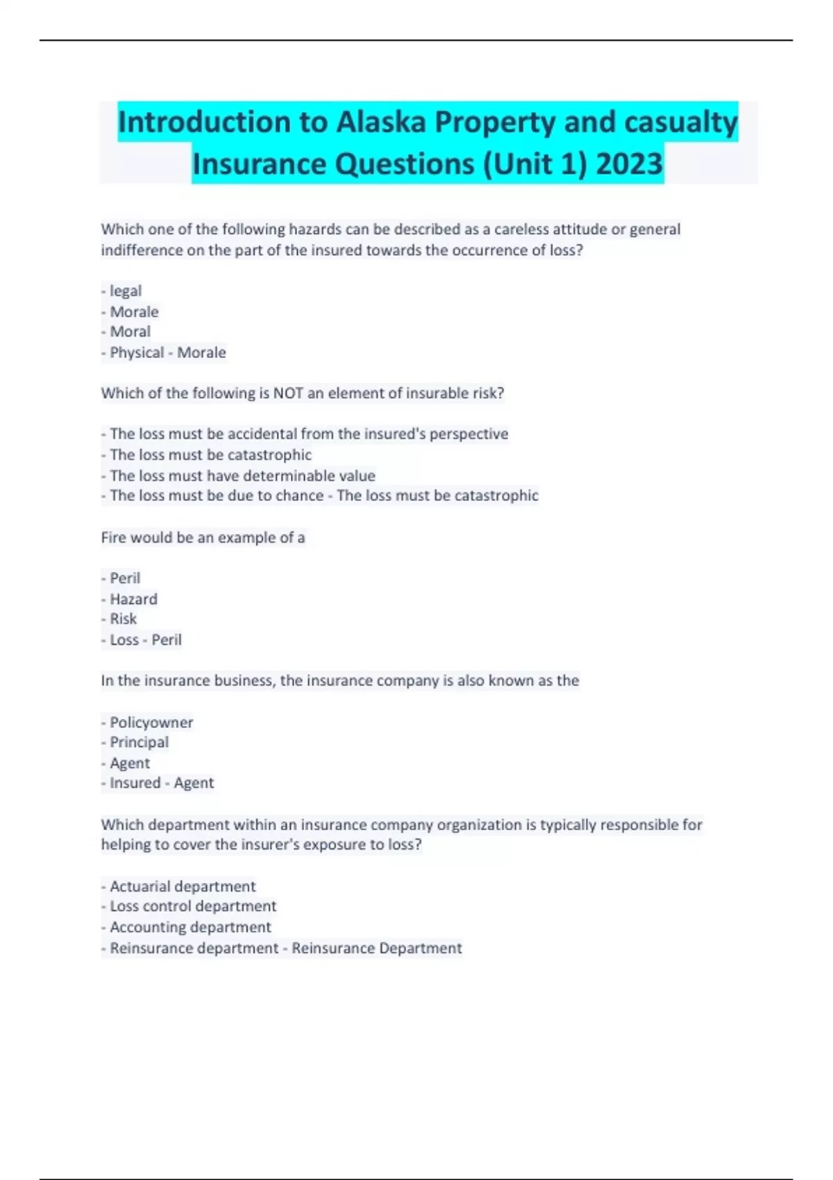 Introduction to Alaska Property and casualty Insurance Questions (Unit 1) 2023