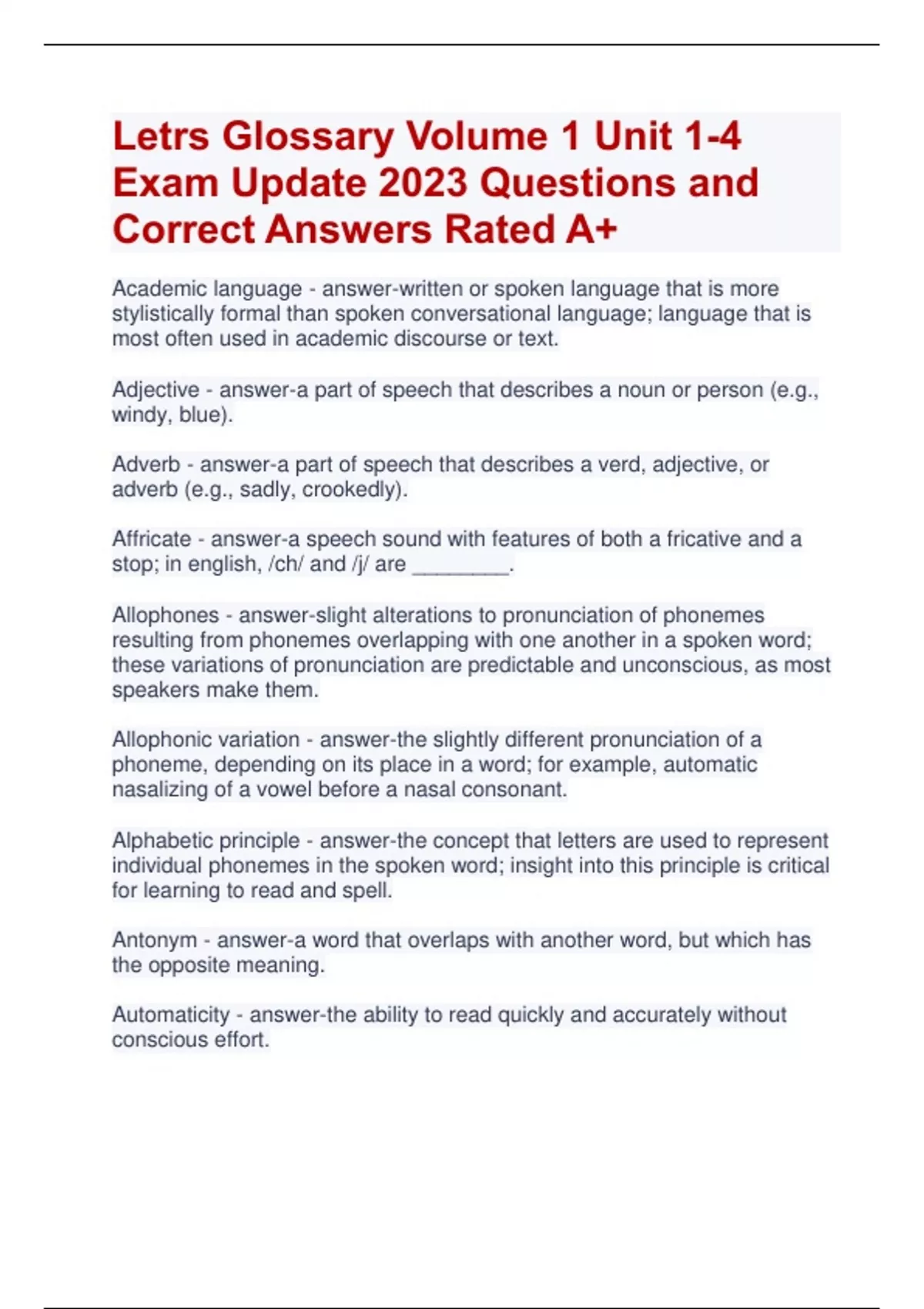 Letrs Glossary Volume 1 Unit 1-4 Exam Update 2023 Questions and Correct Answers Rated A+