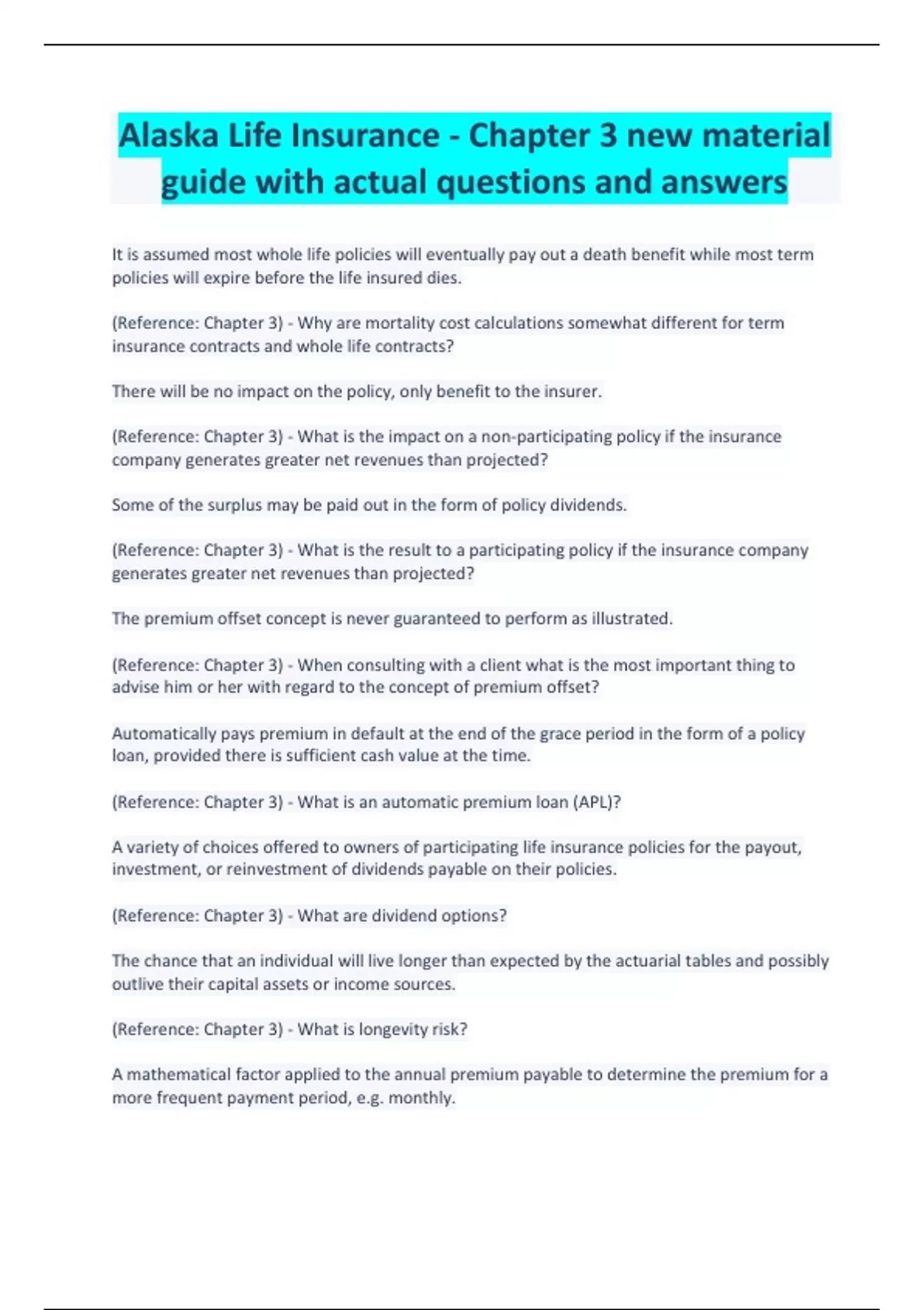 Alaska Life Insurance - Chapter 3 new material guide with actual questions and answers
