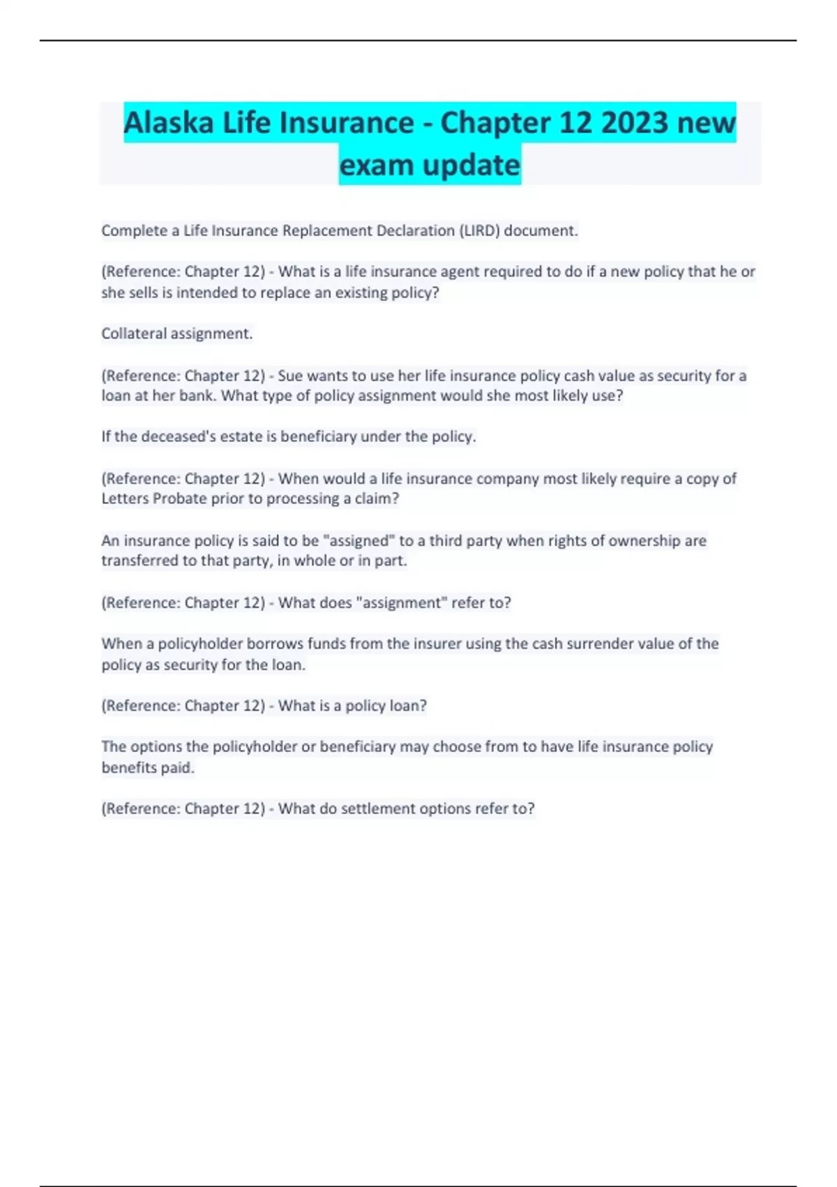 Alaska Life Insurance - Chapter 12 2023 new exam update