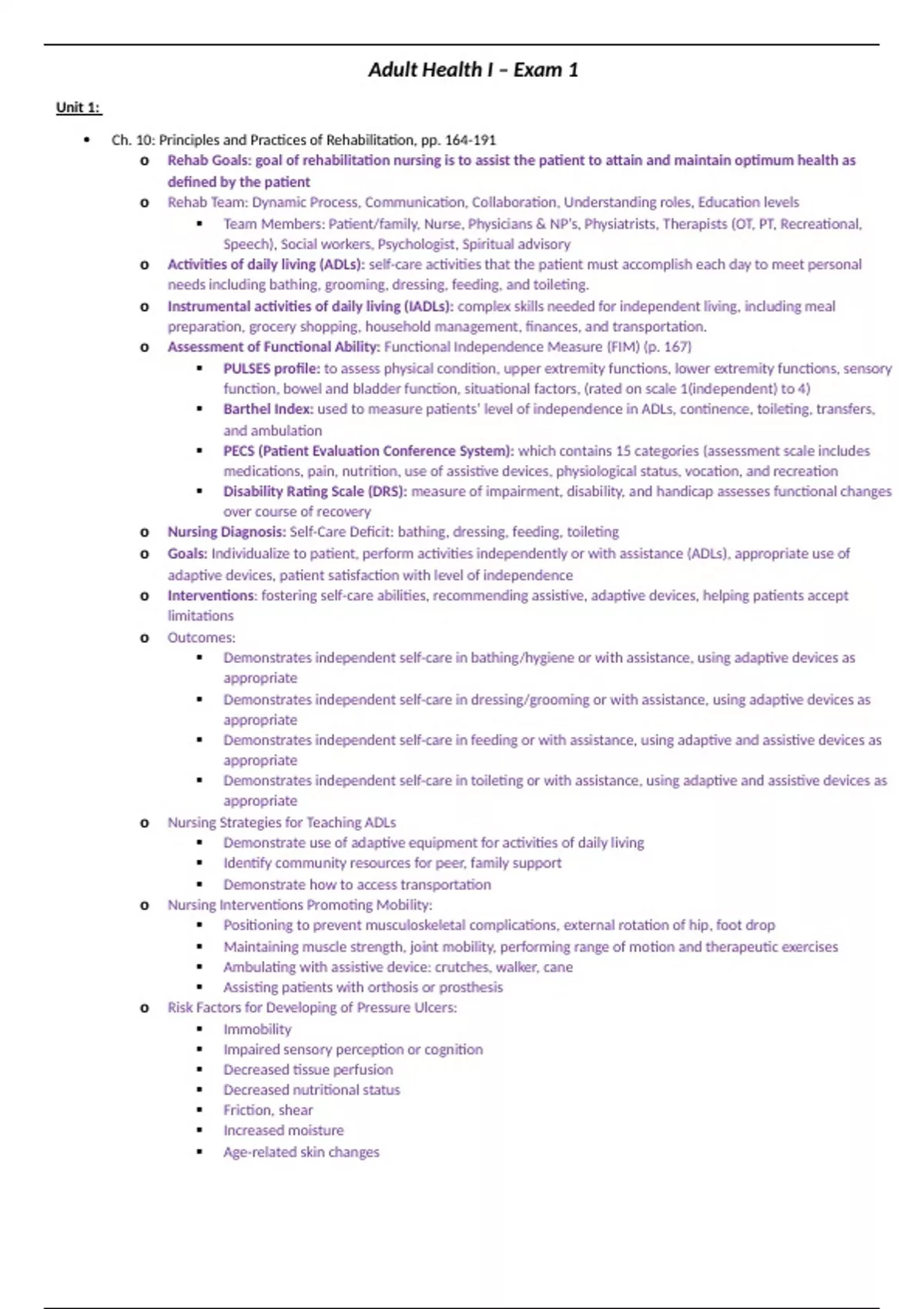Ch. 10: Principles and Practices of Rehabilitation, pp. 164-191 o Rehab Goals: goal of rehabilitation nursing is to assist the patient to attain and maintain optimum health as defined by the patient o Rehab Team: Dynamic Process, Communication, Collaboration, Understanding roles, Education levels  Team Members: Patient/family, Nurse, Physicians & NP’s, Physiatrists, Therapists (OT, PT, Recreational, Speech), Social workers, Psychologist, Spiritual advisory o Activities of daily living (ADLs): self-care activities that the patient must accomplish each day to meet personal needs including bathing, grooming, dressing, feeding, and toileting. o Instrumental activities of daily living (IADLs): complex skills needed for independent living, including meal preparation, grocery shopping, household management, finances, and transportation. o Assessment of Functional Ability: Functional Independence Measure (FIM) (p. 167)  PULSES profile: to assess physical condition, upper extremity functions, lower extremity functions, sensory function, bowel and bladder function, situational factors, (rated on scale 1(independent) to 4)  Barthel Index: used to measure patients’ level of independence in ADLs, continence, toileting, transfers, and ambulation  PECS (Patient Evaluation Conference System): which contains 15 categories (assessment scale includes medications, pain, nutrition, use of assistive devices, physiological status, vocation, and recreation  Disability Rating Scale (DRS): measure of impairment, disability, and handicap assesses functional changes over course of recovery o Nursing Diagnosis: Self-Care Deficit: bathing, dressing, feeding, toileting o Goals: Individualize to patient, perform activities independently or with assistance (ADLs), appropriate use of adaptive devices, patient satisfaction with level of independence o Interventions: fostering self-care abilities, recommending assistive, adaptive devices, helping patients accept limitations o Outcomes:  Demonstrates independent self-care in bathing/hygiene or with assistance, using adaptive devices as appropriate  Demonstrates independent self-care in dressing/grooming or with assistance, using adaptive devices as appropriate