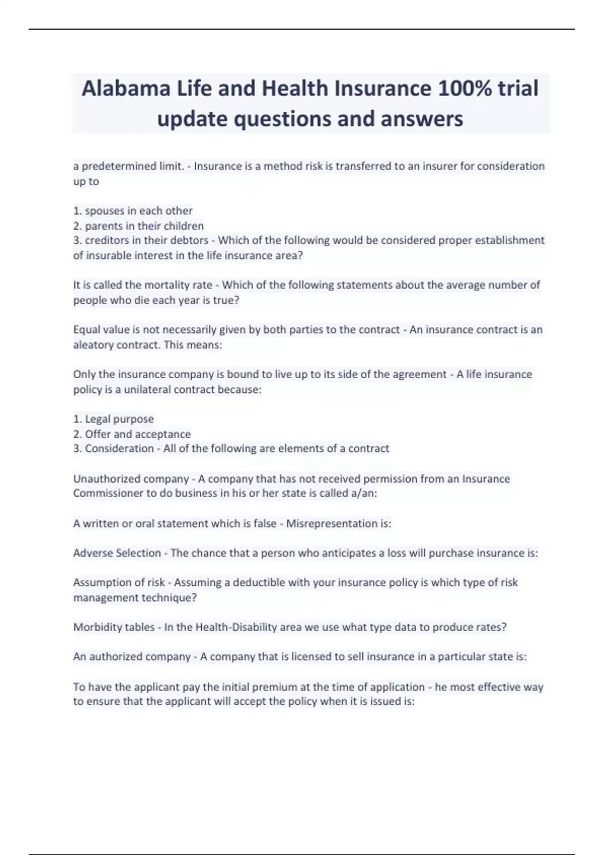 Alabama Life and Health Insurance 100% trial update questions and answers