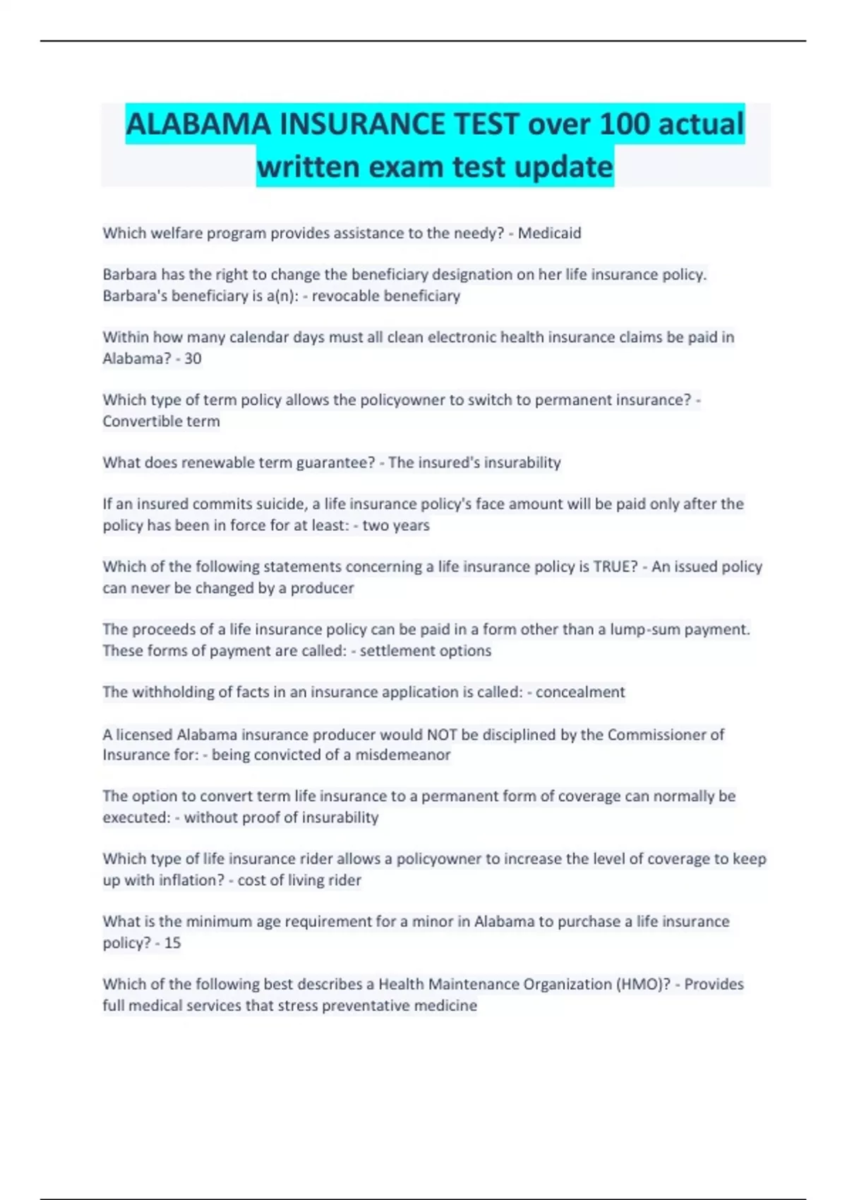 ALABAMA INSURANCE TEST over 100 actual written exam test update