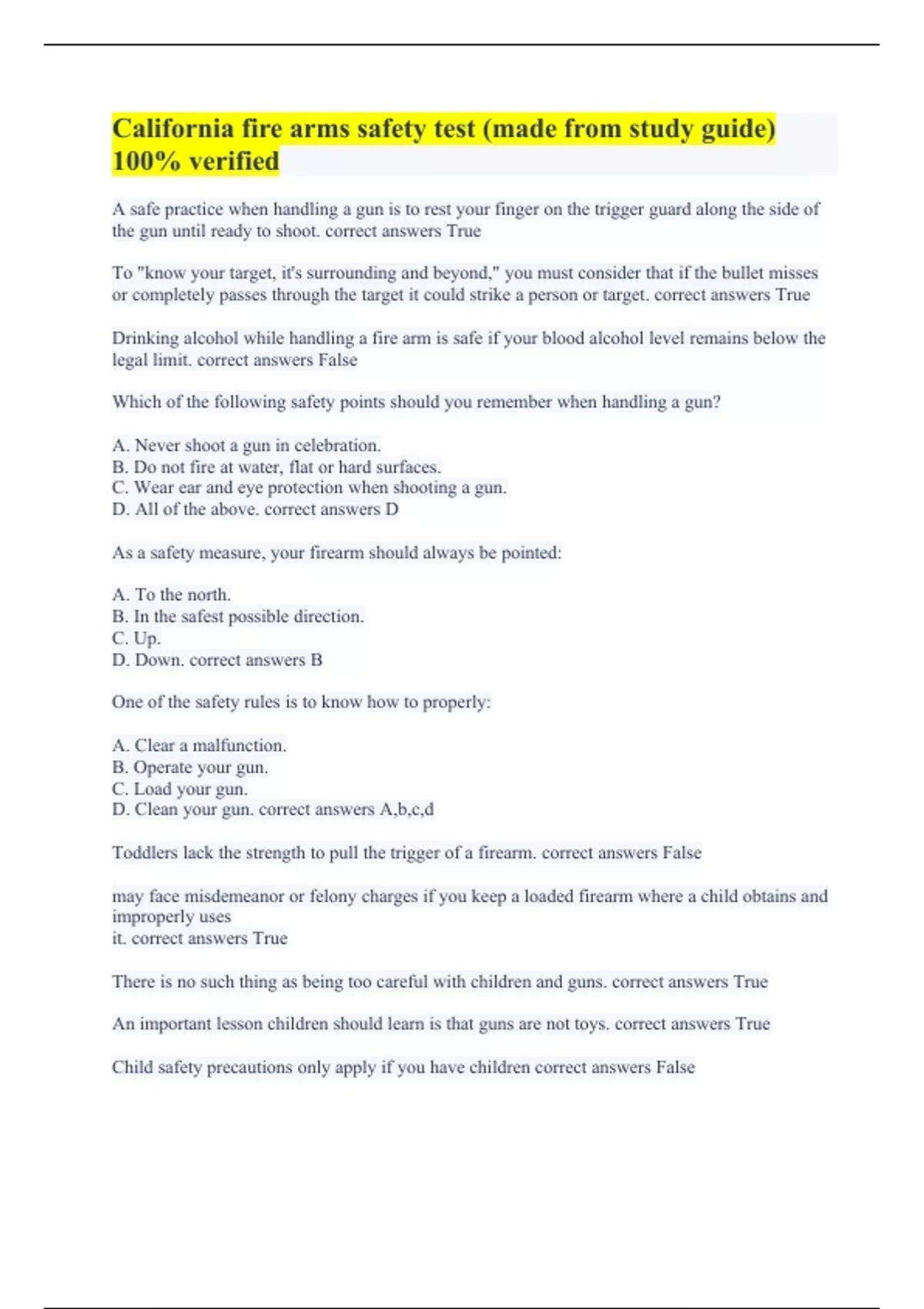 A safe practice when handling a gun is to rest your finger on the trigger guard along the side of the gun until ready to shoot. correct answers True To "know your target, it's surrounding and beyond," you must consider that if the bullet misses or completely passes through the target it could strike a person or target. correct answers True Drinking alcohol while handling a fire arm is safe if your blood alcohol level remains below the legal limit. correct answers False Which of the following safety points should you remember when handling a gun? A. Never shoot a gun in celebration. B. Do not fire at water, flat or hard surfaces. C. Wear ear and eye protection when shooting a gun. D. All of the above. correct answers D As a safety measure, your firearm should always be pointed: A. To the north. B. In the safest possible direction. C. Up. D. Down. correct answers B One of the safety rules is to know how to properly: A. Clear a malfunction. B. Operate your gun. C. Load your gun. D. Clean your gun. correct answers A,b,c,d Toddlers lack the strength to pull the trigger of a firearm. correct answers False may face misdemeanor or felony charges if you keep a loaded firearm where a child obtains and improperly uses it. correct answers True There is no such thing as being too careful with children and guns. correct answers True An important lesson children should learn is that guns are not toys. correct answers True Child safety precautions only apply if you have children correct answers False
