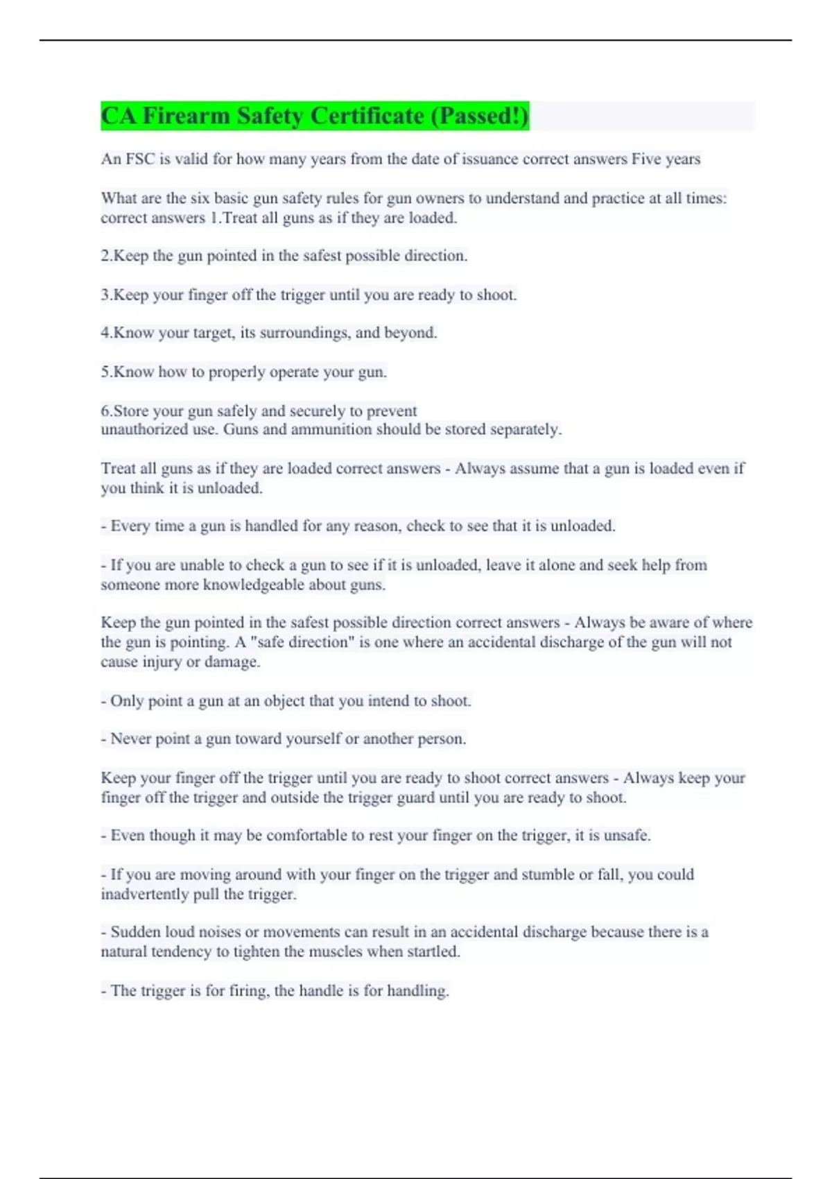 An FSC is valid for how many years from the date of issuance correct answers Five years What are the six basic gun safety rules for gun owners to understand and practice at all times: correct answers 1.Treat all guns as if they are loaded. 2.Keep the gun pointed in the safest possible direction. 3.Keep your finger off the trigger until you are ready to shoot. 4.Know your target, its surroundings, and beyond. 5.Know how to properly operate your gun. 6.Store your gun safely and securely to prevent unauthorized use. Guns and ammunition should be stored separately. Treat all guns as if they are loaded correct answers - Always assume that a gun is loaded even if you think it is unloaded. - Every time a gun is handled for any reason, check to see that it is unloaded. - If you are unable to check a gun to see if it is unloaded, leave it alone and seek help from someone more knowledgeable about guns. Keep the gun pointed in the safest possible direction correct answers - Always be aware of where the gun is pointing. A "safe direction" is one where an accidental discharge of the gun will not cause injury or damage. - Only point a gun at an object that you intend to shoot. - Never point a gun toward yourself or another person. Keep your finger off the trigger until you are ready to shoot correct answers - Always keep your finger off the trigger and outside the trigger guard until you are ready to shoot. - Even though it may be comfortable to rest your finger on the trigger, it is unsafe. - If you are moving around with your finger on the trigger and stumble or fall, you could inadvertently pull the trigger. - Sudden loud noises or movements can result in an accidental discharge because there is a natural tendency to tighten the muscles when startled. - The trigger is for firing, the handle is for handling.