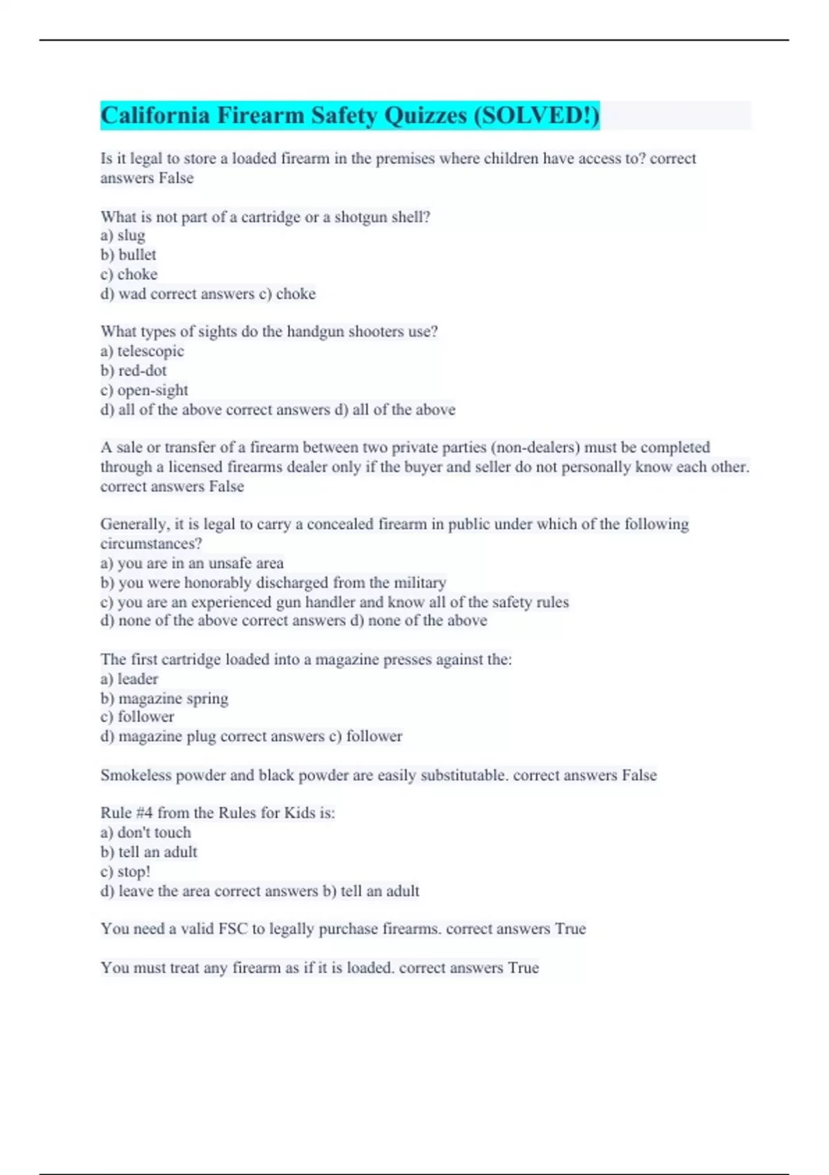 Is it legal to store a loaded firearm in the premises where children have access to? correct answers False What is not part of a cartridge or a shotgun shell? a) slug b) bullet c) choke d) wad correct answers c) choke What types of sights do the handgun shooters use? a) telescopic b) red-dot c) open-sight d) all of the above correct answers d) all of the above A sale or transfer of a firearm between two private parties (non-dealers) must be completed through a licensed firearms dealer only if the buyer and seller do not personally know each other. correct answers False Generally, it is legal to carry a concealed firearm in public under which of the following circumstances? a) you are in an unsafe area b) you were honorably discharged from the military c) you are an experienced gun handler and know all of the safety rules d) none of the above correct answers d) none of the above The first cartridge loaded into a magazine presses against the: a) leader b) magazine spring c) follower d) magazine plug correct answers c) follower Smokeless powder and black powder are easily substitutable. correct answers False Rule #4 from the Rules for Kids is: a) don't touch b) tell an adult c) stop! d) leave the area correct answers b) tell an adult You need a valid FSC to legally purchase firearms. correct answers True You must treat any firearm as if it is loaded. correct answers True