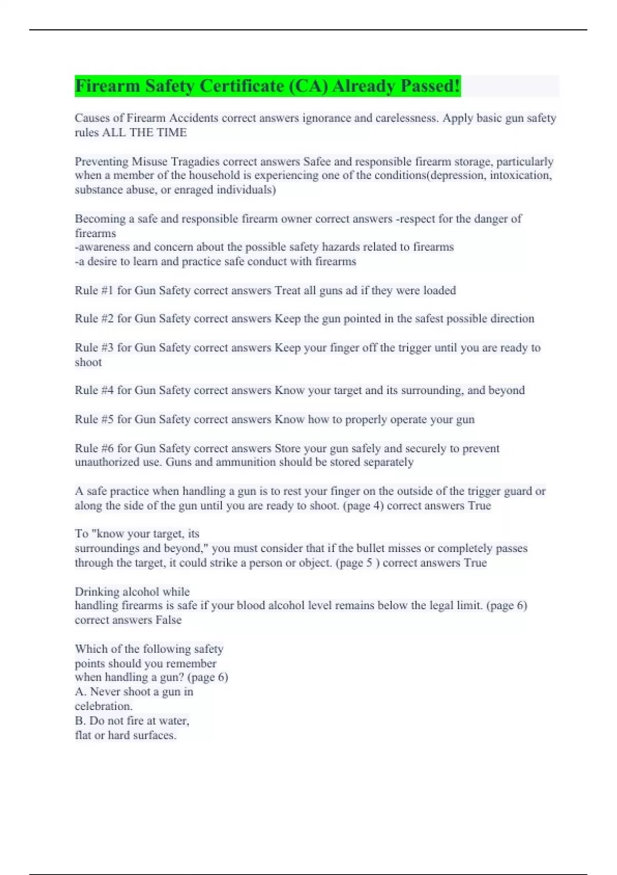 Causes of Firearm Accidents correct answers ignorance and carelessness. Apply basic gun safety rules ALL THE TIME Preventing Misuse Tragadies correct answers Safee and responsible firearm storage, particularly when a member of the household is experiencing one of the conditions(depression, intoxication, substance abuse, or enraged individuals) Becoming a safe and responsible firearm owner correct answers -respect for the danger of firearms -awareness and concern about the possible safety hazards related to firearms -a desire to learn and practice safe conduct with firearms Rule #1 for Gun Safety correct answers Treat all guns ad if they were loaded Rule #2 for Gun Safety correct answers Keep the gun pointed in the safest possible direction Rule #3 for Gun Safety correct answers Keep your finger off the trigger until you are ready to shoot Rule #4 for Gun Safety correct answers Know your target and its surrounding, and beyond Rule #5 for Gun Safety correct answers Know how to properly operate your gun Rule #6 for Gun Safety correct answers Store your gun safely and securely to prevent unauthorized use. Guns and ammunition should be stored separately A safe practice when handling a gun is to rest your finger on the outside of the trigger guard or along the side of the gun until you are ready to shoot. (page 4) correct answers True To "know your target, its surroundings and beyond," you must consider that if the bullet misses or completely passes through the target, it could strike a person or object. (page 5 ) correct answers True Drinking alcohol while handling firearms is safe if your blood alcohol level remains below the legal limit. (page 6) correct answers False Which of the following safety points should you remember when handling a gun? (page 6) A. Never shoot a gun in celebration. B. Do not fire at water, flat or hard surfaces.