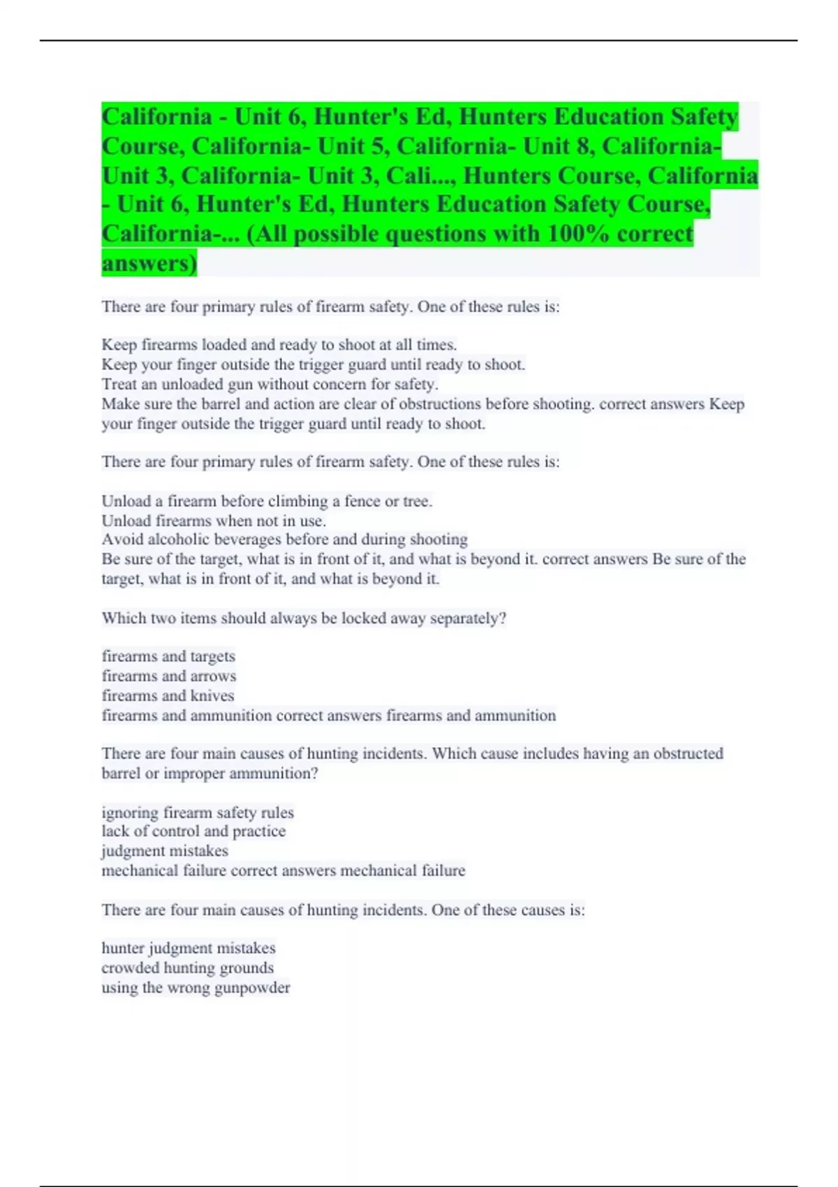 There are four primary rules of firearm safety. One of these rules is: Keep firearms loaded and ready to shoot at all times. Keep your finger outside the trigger guard until ready to shoot. Treat an unloaded gun without concern for safety. Make sure the barrel and action are clear of obstructions before shooting. correct answers Keep your finger outside the trigger guard until ready to shoot. There are four primary rules of firearm safety. One of these rules is: Unload a firearm before climbing a fence or tree. Unload firearms when not in use. Avoid alcoholic beverages before and during shooting Be sure of the target, what is in front of it, and what is beyond it. correct answers Be sure of the target, what is in front of it, and what is beyond it. Which two items should always be locked away separately? firearms and targets firearms and arrows firearms and knives firearms and ammunition correct answers firearms and ammunition There are four main causes of hunting incidents. Which cause includes having an obstructed barrel or improper ammunition? ignoring firearm safety rules lack of control and practice judgment mistakes mechanical failure correct answers mechanical failure There are four main causes of hunting incidents. One of these causes is: hunter judgment mistakes crowded hunting grounds using the wrong gunpowder
