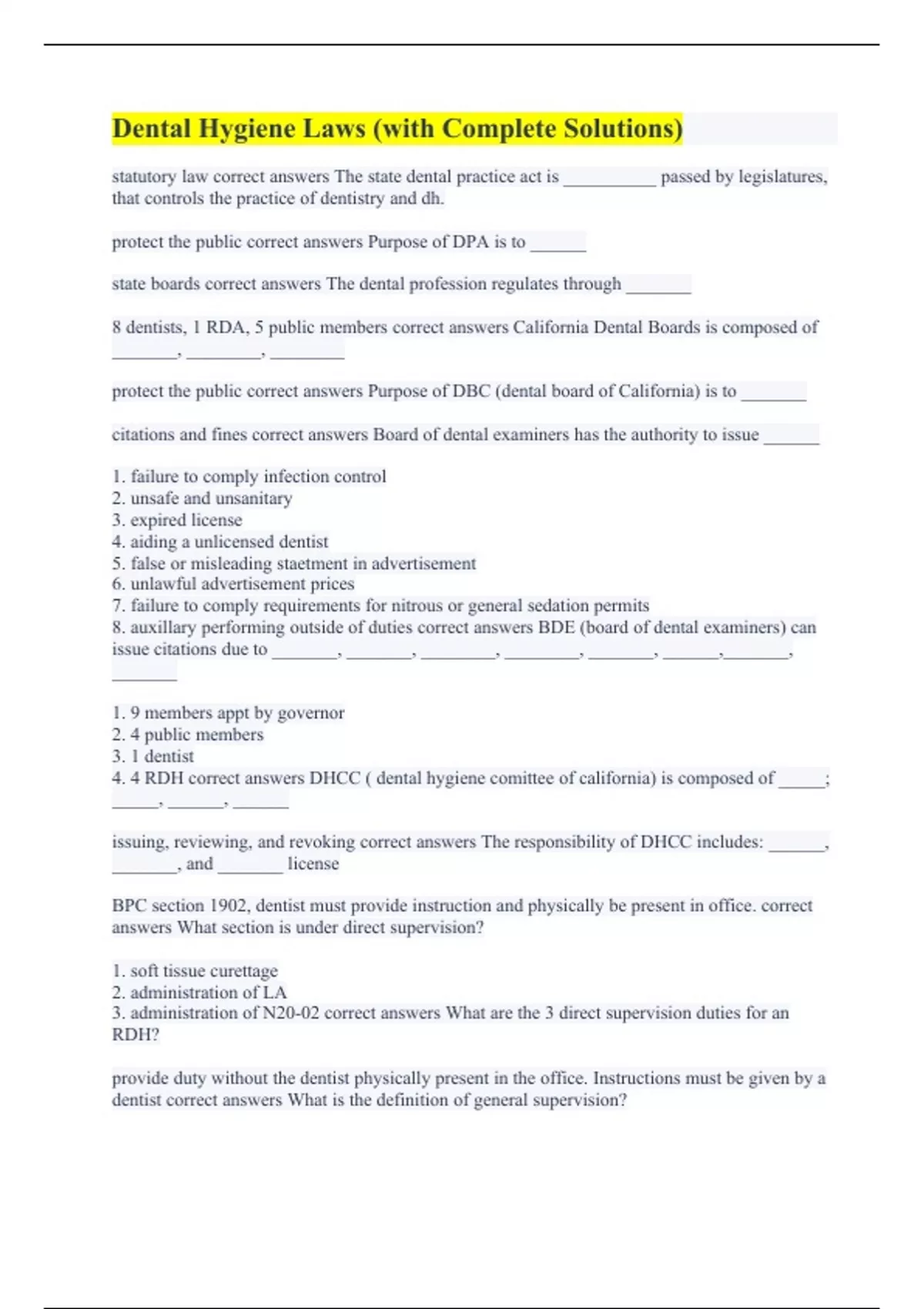 statutory law correct answers The state dental practice act is __________ passed by legislatures, that controls the practice of dentistry and dh. protect the public correct answers Purpose of DPA is to ______ state boards correct answers The dental profession regulates through _______ 8 dentists, 1 RDA, 5 public members correct answers California Dental Boards is composed of _______, ________, ________ protect the public correct answers Purpose of DBC (dental board of California) is to _______ citations and fines correct answers Board of dental examiners has the authority to issue ______ 1. failure to comply infection control 2. unsafe and unsanitary 3. expired license 4. aiding a unlicensed dentist 5. false or misleading staetment in advertisement 6. unlawful advertisement prices 7. failure to comply requirements for nitrous or general sedation permits 8. auxillary performing outside of duties correct answers BDE (board of dental examiners) can issue citations due to _______, _______, ________, ________, _______, ______,_______, _______ 1. 9 members appt by governor 2. 4 public members 3. 1 dentist 4. 4 RDH correct answers DHCC ( dental hygiene comittee of california) is composed of _____; _____, ______, ______ issuing, reviewing, and revoking correct answers The responsibility of DHCC includes: ______, _______, and _______ license BPC section 1902, dentist must provide instruction and physically be present in office. correct answers What section is under direct supervision? 1. soft tissue curettage 2. administration of LA 3. administration of N20-02 correct answers What are the 3 direct supervision duties for an RDH? provide duty without the dentist physically present in the office. Instructions must be given by a dentist correct answers What is the definition of general supervision?