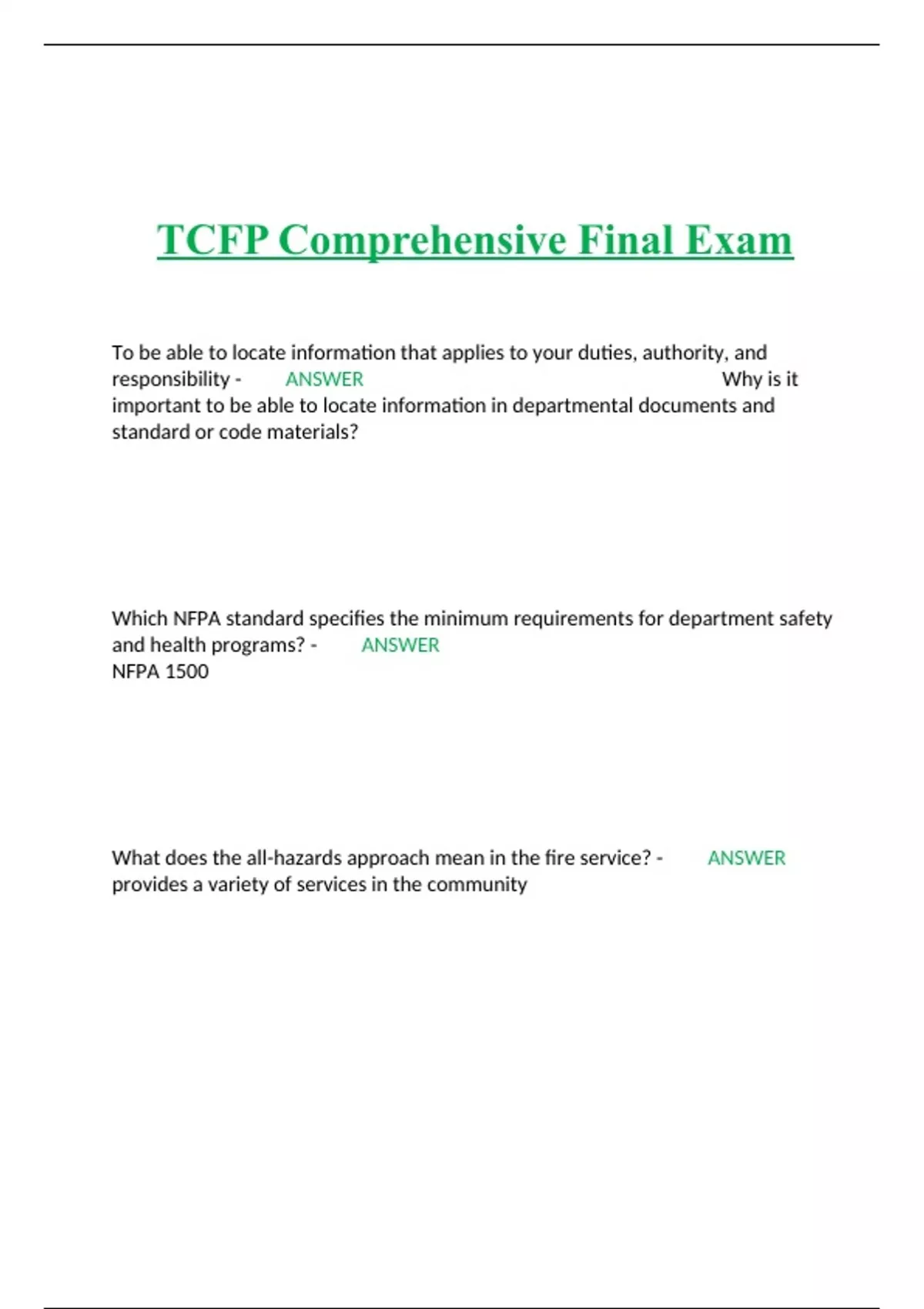 TCFP Comprehensive Final Exam To be able to locate information that applies to your duties, authority, and responsibility - ANSWER Why is it important to be able to locate information in departmental documents and standard or code materials? Which NFPA standard specifies the minimum requirements for department safety and health programs? - ANSWER NFPA 1500 What does the all-hazards approach mean in the fire service? - ANSWER provides a variety of services in the community Which of the following guidelines demonstrates radio communications best practices? - ANSWER Speak with a loud, controlled, clear voice. When using a mobile or portable radio, how should the antenna be positioned for the best transmission? - ANSWER Vertically What is the best way to handle a nonemergency complaint call if the caller is upset or angry? - ANSWER Remain calm and courteous and refer the caller to the appropriate officer or division. Which entity regulates the construction of mobile or manufactured homes in the United States? - ANSWER The Department of Housing and Urban Development (HUD)