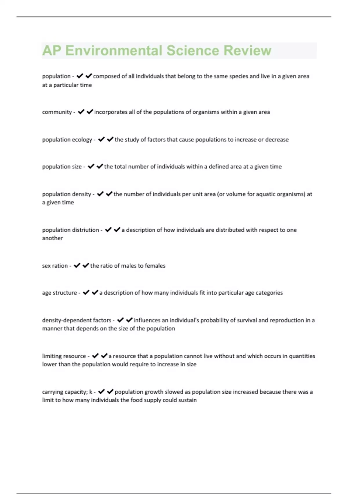 population - composed of all individuals that belong to the same species and live in a given area at a particular time community - incorporates all of the populations of organisms within a given area population ecology - the study of factors that cause populations to increase or decrease population size - the total number of individuals within a defined area at a given time population density - the number of individuals per unit area (or volume for aquatic organisms) at a given time population distriution - a description of how individuals are distributed with respect to one another sex ration - the ratio of males to females age structure - a description of how many individuals fit into particular age categories density-dependent factors - influences an individual's probability of survival and reproduction in a manner that depends on the size of the population limiting resource - a resource that a population cannot live without and which occurs in quantities lower than the population would require to increase in size carrying capacity; k - population growth slowed as population size increased because there was a limit to how many individuals the food supply could sustainDensity-independent factors - have the same effect on an individuals probability of survival and amount of reproduction at any population size
