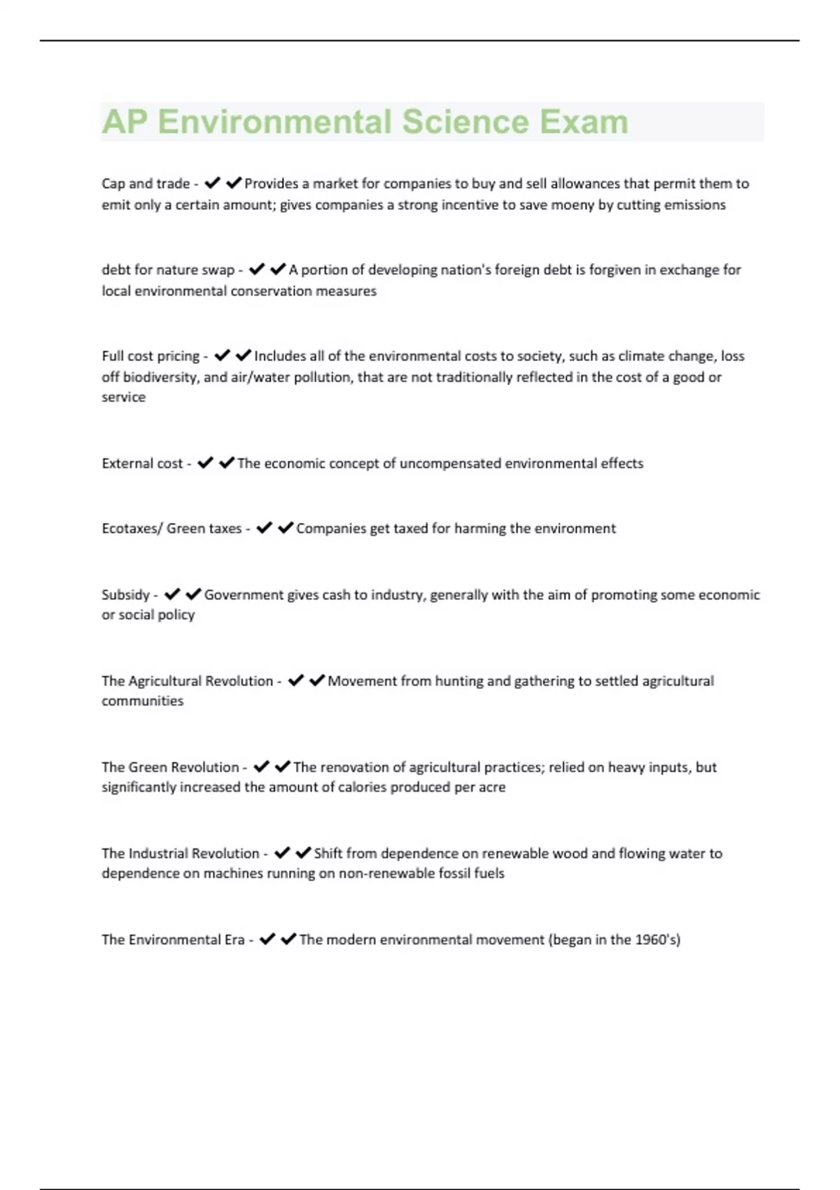 Cap and trade - Provides a market for companies to buy and sell allowances that permit them to emit only a certain amount; gives companies a strong incentive to save moeny by cutting emissions debt for nature swap - A portion of developing nation's foreign debt is forgiven in exchange for local environmental conservation measures Full cost pricing - Includes all of the environmental costs to society, such as climate change, loss off biodiversity, and air/water pollution, that are not traditionally reflected in the cost of a good or service External cost - The economic concept of uncompensated environmental effects Ecotaxes/ Green taxes - Companies get taxed for harming the environment Subsidy - Government gives cash to industry, generally with the aim of promoting some economic or social policy The Agricultural Revolution - Movement from hunting and gathering to settled agricultural communities The Green Revolution - The renovation of agricultural practices; relied on heavy inputs, but significantly increased the amount of calories produced per acre The Industrial Revolution - Shift from dependence on renewable wood and flowing water to dependence on machines running on non-renewable fossil fuels The Environmental Era - The modern environmental movement (began in the 1960's)The Early Conservation Era - U.S. started to get crowded; concern for resource use, public health initiatives, and preserving public lands grew Drought and wildfires in Western U.S. and Canada - drastically reducing the amount of carbon put into the atmosphere will lessen the effect, bu it won't be enough to bring the risk down to levels that won't require big decisions regarding water usage Flint Michigan water crisis - after deciding to switch water sources in an effort to save money, supply pipes with major corrosion and lead leached into the water, which led to a man-made public health crisis Syrian refugees/link to climate change - a drought caused by migration that exacerbated the socio-economic issues that were already facing a country. it has been argued that be exacerbating the socio-economic issues, it could have contributed to the spiral of issues that lead to the civil war Fires in Indonesia/Indonesia Haze - the government is trying to get this under control by arresting members of the businesses responsible, as it is causing major health issues and releasing massive amounts of carbon into the atmosphere. however, there is a link between the private sector and the government which is allowing businesses to continue to get away with these unsustainable practices Animus River - at the Gold King Mine near Colorado, EPA workers caused the release of toxic waste water while attempting to drain ponded water near the entrance of the mine. the waste included heavy metals such as cadmium and lead, and other toxic elements, such as arsenic, beryllium, zinc, iron, and copper into Cement Creek, a tributary of this major river in Colorado