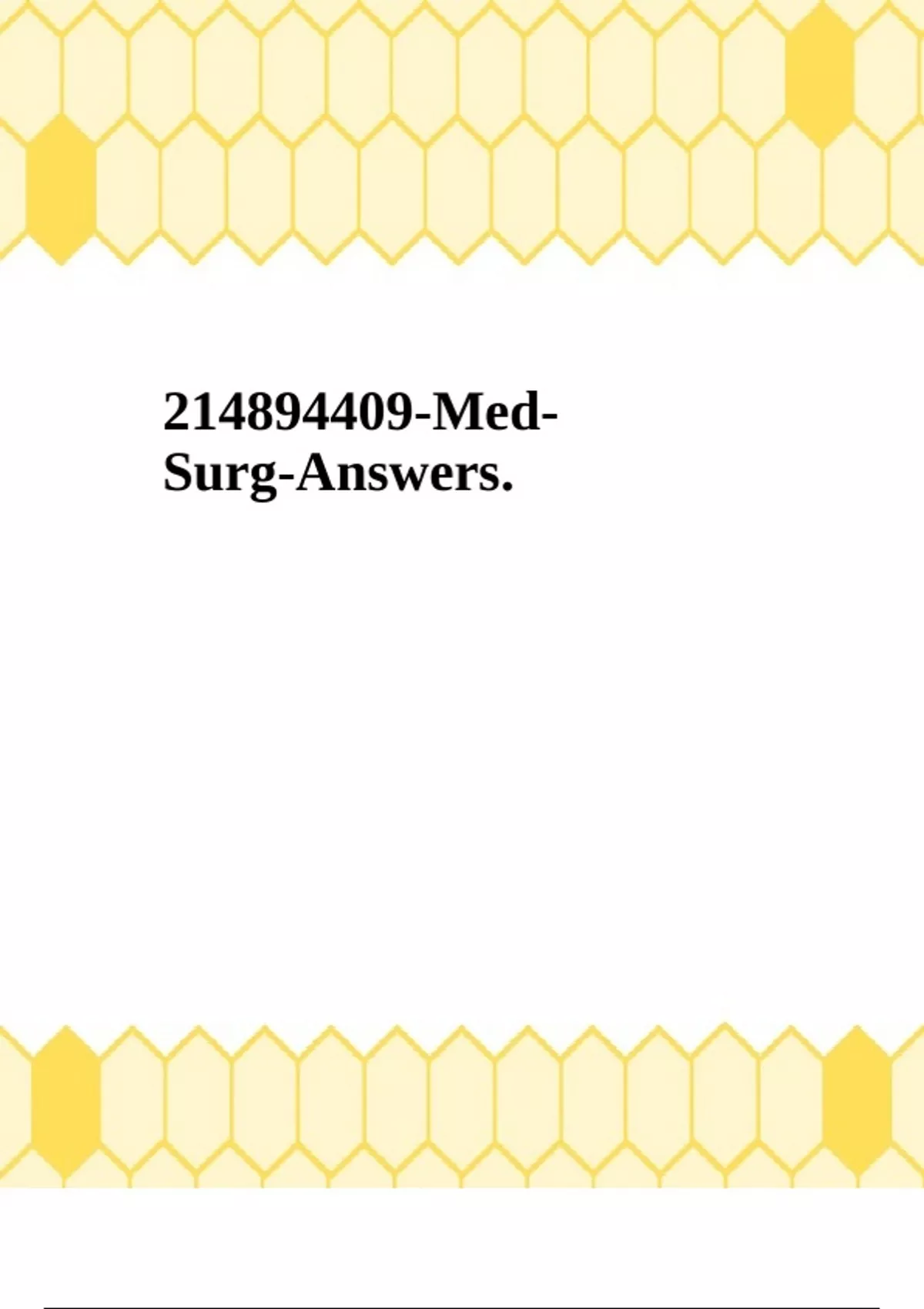 -Med- Surg-Answers. Detailed working, solutions, memo, notes & explanations.1. A home care nurse is preparing to visit a client with a diagnosis of Meniere’s disease. The nurse review’s the physician’s orders and expects to note that which of the following dietary measures will be prescribed? A. low fiber diet with decreased fluids B. low sodium diet and fluid restriction C. low carbohydrate diet and elimination of red meats D. low fat with restriction of citrus fruits 2. A nurse is assigned to care for a client who has just undergone eye surgery. The nurse plans to instruct the client that which of the following activities is permitted in the postoperative period? A. reading B. watching television C. bending over D. lifting objects 3. A nurse is instilling an otic solution into an adult client’s left ear. The nurse avoids doing which of the following as part of this procedure? A. warming the solution to room temperature B. placing the client in a side lying position with the ear facing up C. pulling the auricle backward and upward D. placing the tip of the dropper on the edge of the ear canal 4. A client has undergone surgery for glaucoma. The nurse provides which discharge instructions to the clients? A. wound healing usually takes 12 weeks B. expected the vision will be permanently impaired C. a shield or eye patch should be worn to protect the eye D. the sutures are removed after 1 week 5. Which assessment findings provide the best evidence that a client with acute angle-closure glaucoma is responding to drug therapy? A. swelling of the eyelids decreases B. redness of the sclera is reduced C. eye pain is reduced or eliminated D. peripheral vision is diminished 6. At the time of retinal detachment, a client most likely describes which symptoms? A. a seeing flashes of light B. being unable to see light C. feeling discomfort in light D. seeing poorly in daylight 7. The most important health teaching the nurse can provide to the client with conjunctivitis is to: A. eat a well balanced, nutritious diet B. wear sunglasses in bright light C. cease sharing towels and washcloths D. avoid products containing aspirin 8. When the nurse prepares the client or the myringotomy, the best explanation as to the purpose for the procedures is that it will: A. prevent permanent hearing loss B. provide a pathway for drainage C. aid in administering medications D. maintain motion of the ear bones 9. A nurse is reviewing the record of the client with a disorder involving the inner ear. Which of the following would the nurse expect to see documented as an assessment finding in this client? A. severe hearing loss B. complaints of severe pain in the affected ear C. complaints of burning in the ear D. complaints of tinnitus 10. A client with a conduction hearing loss asks the nurse how a hearing aid improves hearing. The nurse most accurately informs the client that a hearing aid: A. amplifies sound heard B. makes sounds sharper and clearer C. produces more distinct, crisp, speech D. eliminates garbled background sounds 11. Which nursing action is best for controlling the client’s nosebleed? A. have the client lay down slowly and swallow frequently B. have the client lay down and breathe through his mouth C. have the client lean forward and apply direct pressure D. have the client lean forward and clench his teeth Situation: Benjie 59 years old male was admitted to the hospital complaining of nausea, vomiting, weight loss of 20 lbs, constipation and diarrhea. A diagnosis of carcinoma of the colon was made. 12. A sigmoidoscopy was performed as a diagnostic measures. What position Benjie should assume for hi examination? A. knee-chest B. Sim’s C. Fowler’s D. Trendelenburg 13. As part of the preparation of the client for sigmoidoscopy the nurse should: A. explain to Benjie that he will swallow a chalk-like substance B. administer a cathartic the night before C. withhold fluids and foods on the day of examination D. administer cleansing enema in the morning of the examination 14. The doctor performed a colostomy, post operative nursing care include: A. keeping the skin around the opening clean and dry B. limiting visitors C. withholding D. limiting fluid intake 15. During the irrigation of the colostomy, Benjie complains of abdominal cramps, the nurse should: A. discontinue the irrigation B. clamp the catheter for a few minutes C. advance the catheter about one inch D. add color water 16. If colostomy irrigation is done, the height of the irrigator can must be how many inches above the stoma? A. 14-18 inches B. 18-20 inches C. 20-24 inches D. 10-14 inches 17. Which of the following gastrointestinal condition is known to predispose to Cancer of the colon? A. hemorrhoids B. intussusception C. islated colonic polyps D. pyloric stenosis Situation: Mr. J was brought to the ER complaining of pain located in the upper abdomen hematemesis and melena. Diagnosis is peptic ulcer. 18. A frequent discomfort experience by Mr. J due to his peptic ulcer is: A. diarrhea B. vomiting C. eructation D. nausea 19. Which of this diagnostic measure is not indicated for Mr. J? A. x-ray of the abdomen B. patient’s history C. gastrointestinal series D. gastric analysis 20. The purpose of dietary treatment of Mr. J is to: A. neutralize the free HCL in the stomach B. delay gastric emptying C. prevent constipation
