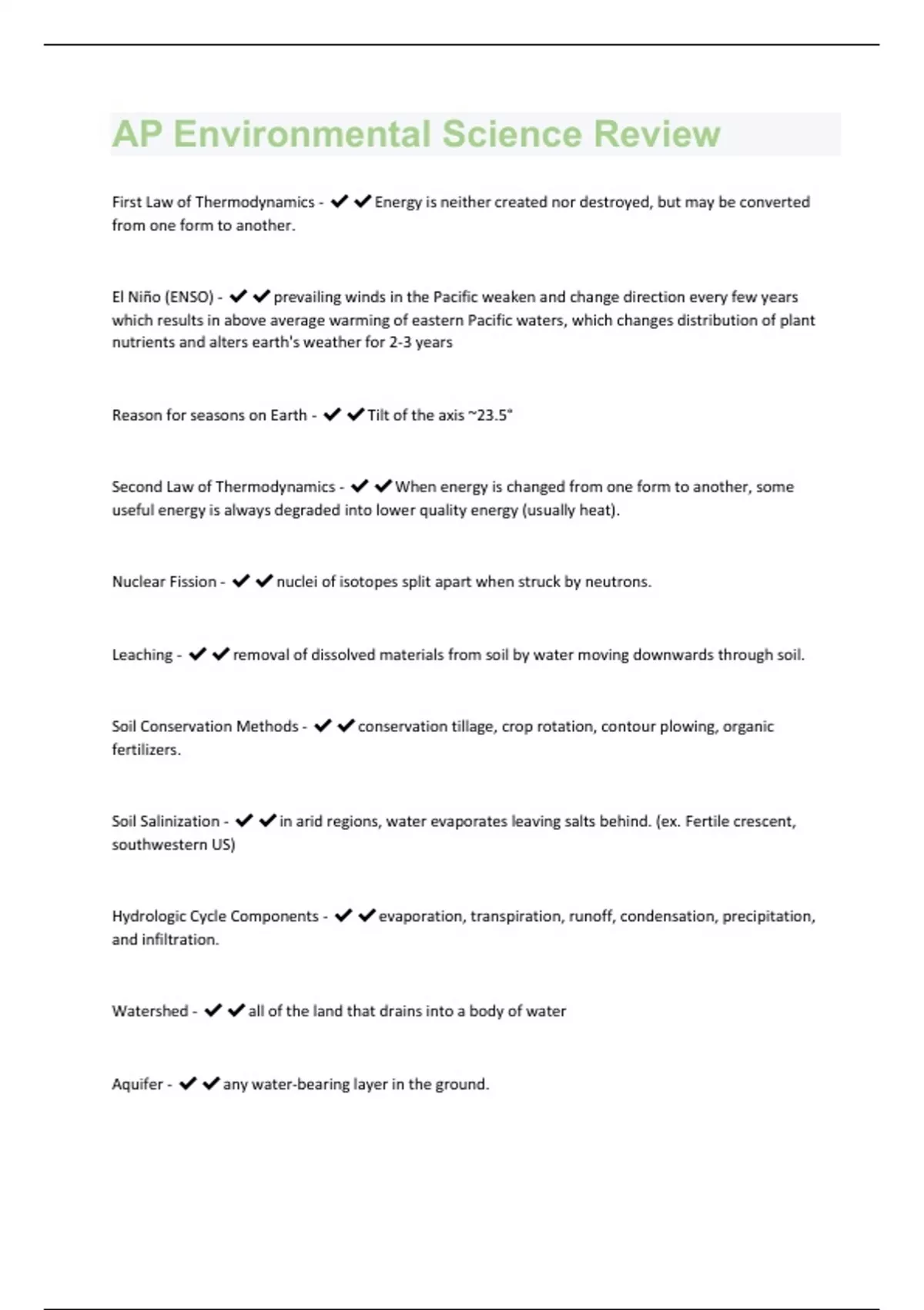 First Law of Thermodynamics - Energy is neither created nor destroyed, but may be converted from one form to another. El Niño (ENSO) - prevailing winds in the Pacific weaken and change direction every few years which results in above average warming of eastern Pacific waters, which changes distribution of plant nutrients and alters earth's weather for 2-3 years Reason for seasons on Earth - Tilt of the axis ~23.5° Second Law of Thermodynamics - When energy is changed from one form to another, some useful energy is always degraded into lower quality energy (usually heat). Nuclear Fission - nuclei of isotopes split apart when struck by neutrons. Leaching - removal of dissolved materials from soil by water moving downwards through soil. Soil Conservation Methods - conservation tillage, crop rotation, contour plowing, organic fertilizers. Soil Salinization - in arid regions, water evaporates leaving salts behind. (ex. Fertile crescent, southwestern US) Hydrologic Cycle Components - evaporation, transpiration, runoff, condensation, precipitation, and infiltration. Watershed - all of the land that drains into a body of water Aquifer - any water-bearing layer in the ground.Salt Water Intrusion - near the coast, overpumping of groundwater causes saltwater to move into the aquifer. La Nina - "Normal" year, easterly trade winds and ocean currents pool warm water in the western Pacific, allowing upwelling of nutrient rich water off the West coast of South America. Nitrogen Fixation - because atmospheric N cannot be used directly by plants, it must first be converted into ammonia by bacteria. Ammonification - decomposers covert organic waste into ammonia.