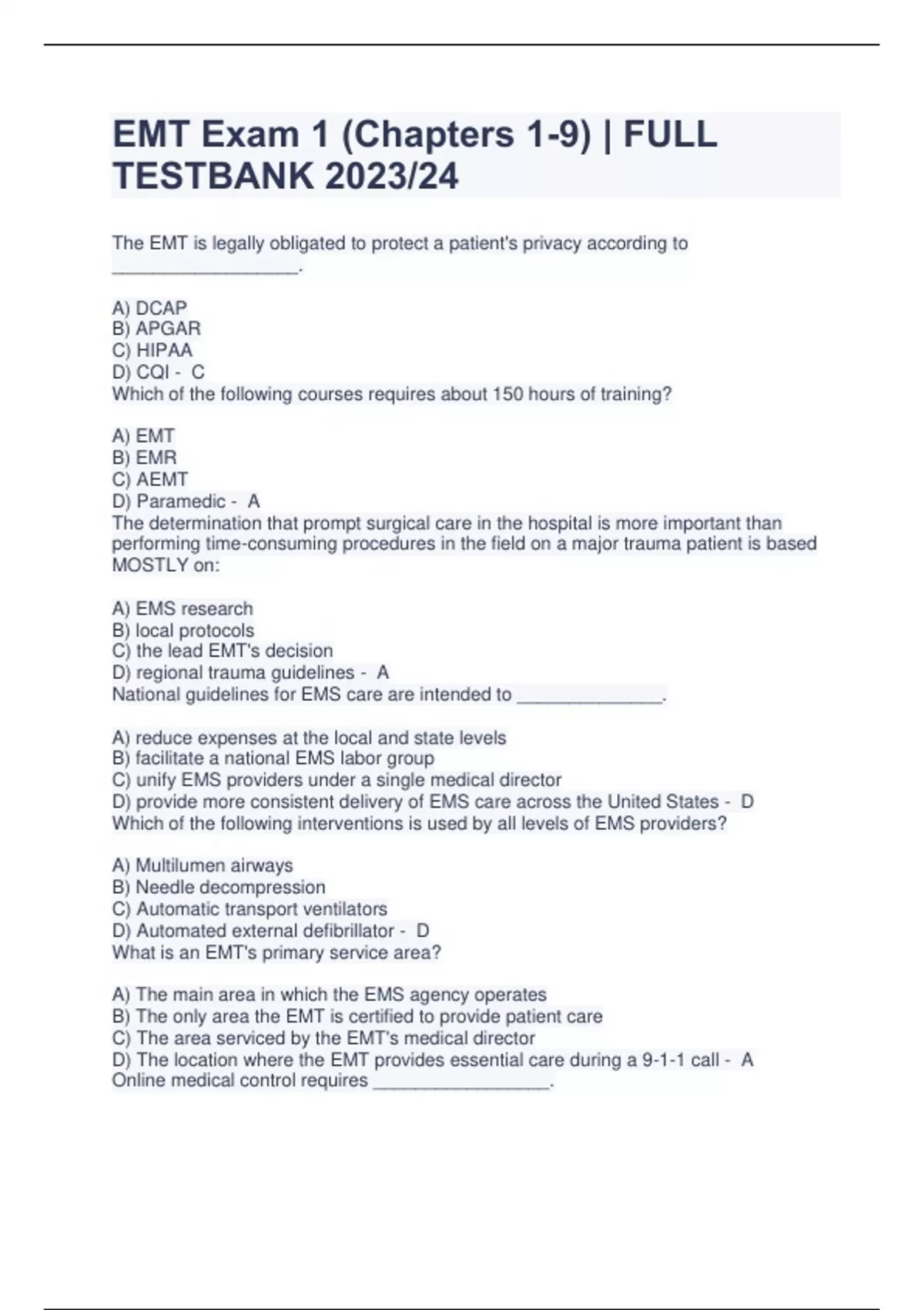 EMT Exam 1 (Chapters 1-9) | FULL TESTBANK 2023/24 The EMT is legally obligated to protect a patient's privacy according to __________________. A) DCAP B) APGAR C) HIPAA D) CQI - C Which of the following courses requires about 150 hours of training? A) EMT B) EMR C) AEMT D) Paramedic - A The determination that prompt surgical care in the hospital is more important than performing time-consuming procedures in the field on a major trauma patient is based MOSTLY on: A) EMS research B) local protocols C) the lead EMT's decision D) regional trauma guidelines - A National guidelines for EMS care are intended to ______________. A) reduce expenses at the local and state levels B) facilitate a national EMS labor group C) unify EMS providers under a single medical director D) provide more consistent delivery of EMS care across the United States - D Which of the following interventions is used by all levels of EMS providers? A) Multilumen airways B) Needle decompression C) Automatic transport ventilators D) Automated external defibrillator - D What is an EMT's primary service area? A) The main area in which the EMS agency operates B) The only area the EMT is certified to provide patient care C) The area serviced by the EMT's medical director D) The location where the EMT provides essential care during a 9-1-1 call - A Online medical control requires _________________. A) written protocols approved by medical control B) phone or radio contact with the medical director C) the presence of an advanced-level provider D) a physician's presence on the scene of the call - B What should an EMT do to limit errors in the field? A) Carry an EMT text for reference at all times B) Deviate from established standards when necessary C) Follow the agency's written protocol D) Contact medical direction before initiating any treatments - C Prehospital patient care decisions should be based on______________. A) the opinions of physicians B) EMS research C) the experiences of EMT"s D) an EMS Agency's fiscal resources - B American Heart Association protocols are based on _____________. A) evidence-based research B) trends in the EMS community C) theories ready for field trial D) opinions from a core group of cardiologists - A The ability to handle multiple tasks based on their priority is called ______________. A) patient advocacy B) integrity C) time management D) patient empathy - C The ability to take appropriate action with little direction is known as _____________. A) diplomacy B) self-confidence C) time management D) self-motivation - D You are encouraging a patient to go to the hospital by ambulance. You know that a transport will keep you on duty several hours after your regular quitting time. This is an example of _____________. A) undue hardship B) patient advocacy C) scope of practice D) abuse of authority - B Which of the following descriptions MOST accurately portrays emergency medical services (EMS)? A) a vast network of advanced life support (ALS) provider definitive emergency care in the prehospital setting B) a team of health care professionals who are responsible for providing emergency care and transportation to the sick and injured C) a system composed exclusively of emergency medical responders (EMRs) and emergency medical technicians (EMTs) who are responsible for providing care to sick and injured patients D) a team of paramedics and emergency physicians who are responsible for providing emergency care to critically injured patients - B Which of the following statements regarding the Americans With Disabilities Act (ADA) of 1990 is correct? A) the ADA applies to only to individuals with a diagnosed and well-documented physical disability B) the minimum number of hours required to successfully complete an EMT course is less for candidates who are disabled C) the ADA prohibits employers from failing to provide full and equal employment to those who are disabled D) according to the ADA, EMT candidates with a documented disability are exempt from taking the NREMT exam - C As an EMT, you may be authorized to administer aspirin to a patient with chest pain based on: A) the patient's condition B) medical director approval C) an order from a paramedic D) the transport time to the hospital - B (unless in the written protocols in which you do not need the medical director's approval) Which of the following statements regarding the NREMT is correct? A) The NREMT is a governmental agency that certifies EMTs B) EMS training standards are regulated by the NREMT C) the NREMT is the exclusive certifying body for EMTs D) the NREMT provides a national standard for EMS training - D Which of the following is a specific example of the Mobile Integrated Healthcare (MIH) model? A) EMTs assess a patient whose lung disease is "acting up" B) The paramedic administers a patient's flu vaccination C) EMTs respond to a woman who complains of high fever D) Paramedics pick up a patient from an acute care clinic - B You are caring for a driver who struck a light pole. She admits to drinking alcohol but orders you not to tell anyone. You should report the information to ___________. A) the receiving nurse or doctor B) law enforcement personnel C) the state motor vehicle department D) your medical director - A Vector-borne transmission of an infectious organism occurs via: A) animals or insects B) stroke or dust C) direct contact D) inanimate objects - A Which of the following statements regarding the different stages of the grieving process is correct? A) the grieving process typically begins with severe depression B) it is rare that people will jump back and forth between stages C) the stages of the grieving process may occur simultaneously D) bargaining is the most unpleasant of the grieving process - C Common factors that influence how a patient reacts to the stress of an illness or injury include all of the following, EXCEPT: A) assessment by the EMT B) mental disorders C) history of chronic disease D) fear of medical personnel