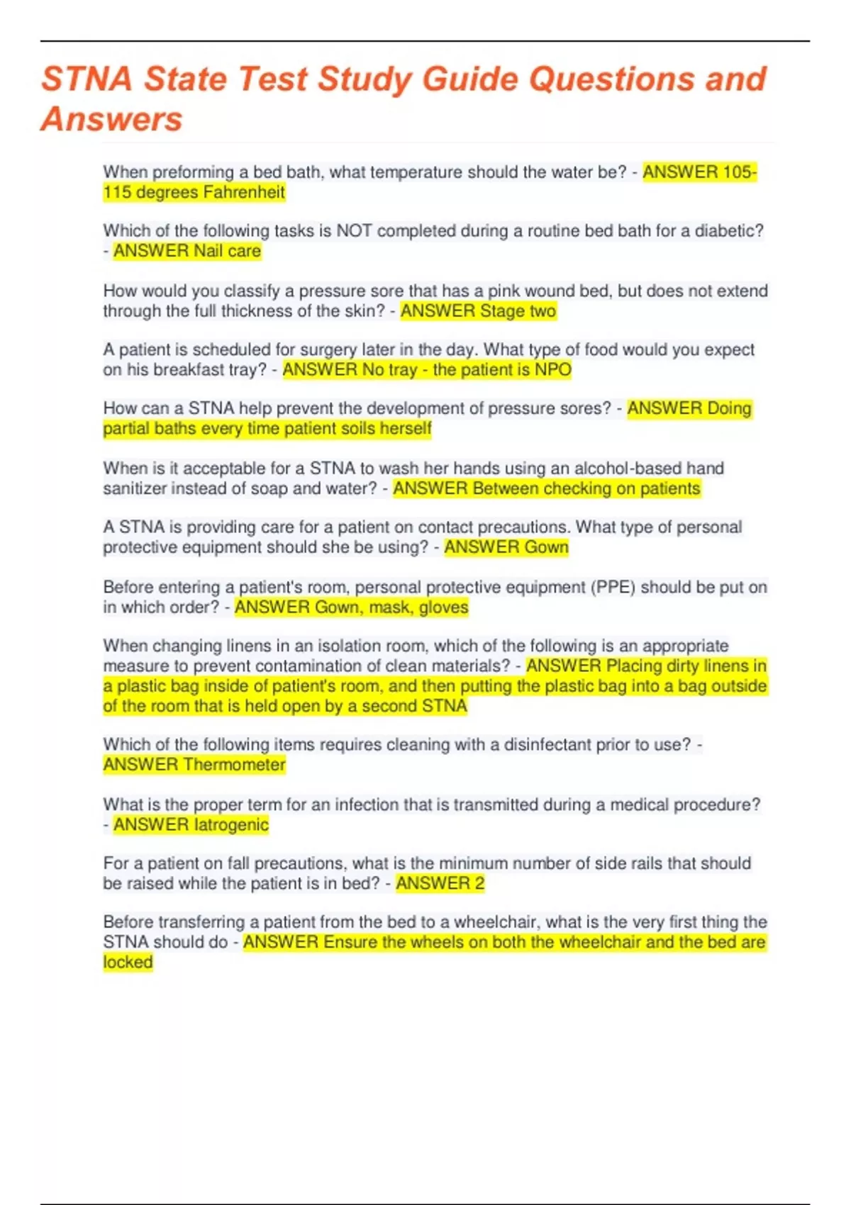 STNA State Test Study Guide Questions and answer 100% solved