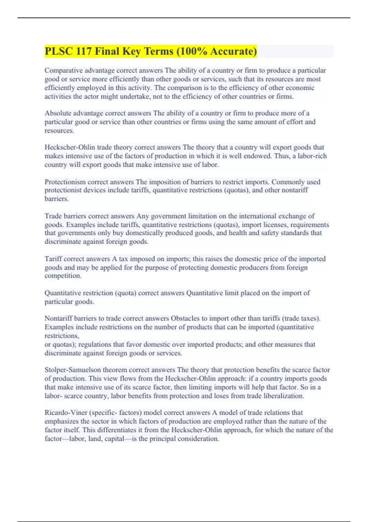 Comparative advantage correct answers The ability of a country or firm to produce a particular good or service more efficiently than other goods or services, such that its resources are most efficiently employed in this activity. The comparison is to the efficiency of other economic activities the actor might undertake, not to the efficiency of other countries or firms. Absolute advantage correct answers The ability of a country or firm to produce more of a particular good or service than other countries or firms using the same amount of effort and resources. Heckscher-Ohlin trade theory correct answers The theory that a country will export goods that makes intensive use of the factors of production in which it is well endowed. Thus, a labor-rich country will export goods that make intensive use of labor. Protectionism correct answers The imposition of barriers to restrict imports. Commonly used protectionist devices include tariffs, quantitative restrictions (quotas), and other nontariff barriers. Trade barriers correct answers Any government limitation on the international exchange of goods. Examples include tariffs, quantitative restrictions (quotas), import licenses, requirements that governments only buy domestically produced goods, and health and safety standards that discriminate against foreign goods. Tariff correct answers A tax imposed on imports; this raises the domestic price of the imported goods and may be applied for the purpose of protecting domestic producers from foreign competition. Quantitative restriction (quota) correct answers Quantitative limit placed on the import of particular goods. Nontariff barriers to trade correct answers Obstacles to import other than tariffs (trade taxes). Examples include restrictions on the number of products that can be imported (quantitative restrictions, or quotas); regulations that favor domestic over imported products; and other measures that discriminate against foreign goods or services. Stolper-Samuelson theorem correct answers The theory that protection benefits the scarce factor of production. This view flows from the Heckscher-Ohlin approach: if a country imports goods that make intensive use of its scarce factor, then limiting imports will help that factor. So in a labor- scarce country, labor benefits from protection and loses from trade liberalization. Ricardo-Viner (specific- factors) model correct answers A model of trade relations that emphasizes the sector in which factors of production are employed rather than the nature of the factor itself. This differentiates it from the Heckscher-Ohlin approach, for which the nature of the factor—labor, land, capital—is the principal consideration.