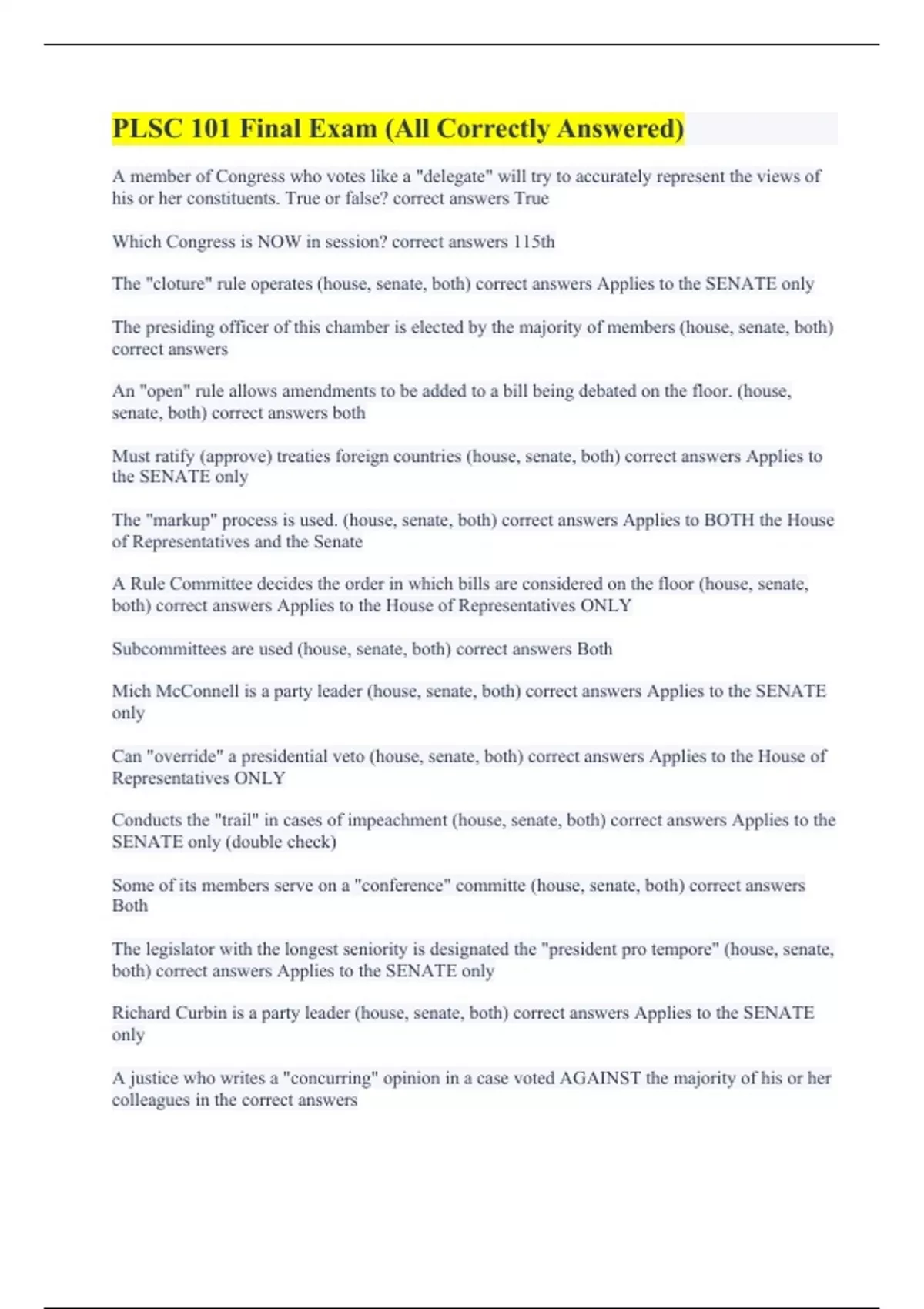 A member of Congress who votes like a "delegate" will try to accurately represent the views of his or her constituents. True or false? correct answers True Which Congress is NOW in session? correct answers 115th The "cloture" rule operates (house, senate, both) correct answers Applies to the SENATE only The presiding officer of this chamber is elected by the majority of members (house, senate, both) correct answers An "open" rule allows amendments to be added to a bill being debated on the floor. (house, senate, both) correct answers both Must ratify (approve) treaties foreign countries (house, senate, both) correct answers Applies to the SENATE only The "markup" process is used. (house, senate, both) correct answers Applies to BOTH the House of Representatives and the Senate A Rule Committee decides the order in which bills are considered on the floor (house, senate, both) correct answers Applies to the House of Representatives ONLY Subcommittees are used (house, senate, both) correct answers Both Mich McConnell is a party leader (house, senate, both) correct answers Applies to the SENATE only Can "override" a presidential veto (house, senate, both) correct answers Applies to the House of Representatives ONLY Conducts the "trail" in cases of impeachment (house, senate, both) correct answers Applies to the SENATE only (double check) Some of its members serve on a "conference" committe (house, senate, both) correct answers Both The legislator with the longest seniority is designated the "president pro tempore" (house, senate, both) correct answers Applies to the SENATE only Richard Curbin is a party leader (house, senate, both) correct answers Applies to the SENATE only A justice who writes a "concurring" opinion in a case voted AGAINST the majority of his or her colleagues in the correct answers