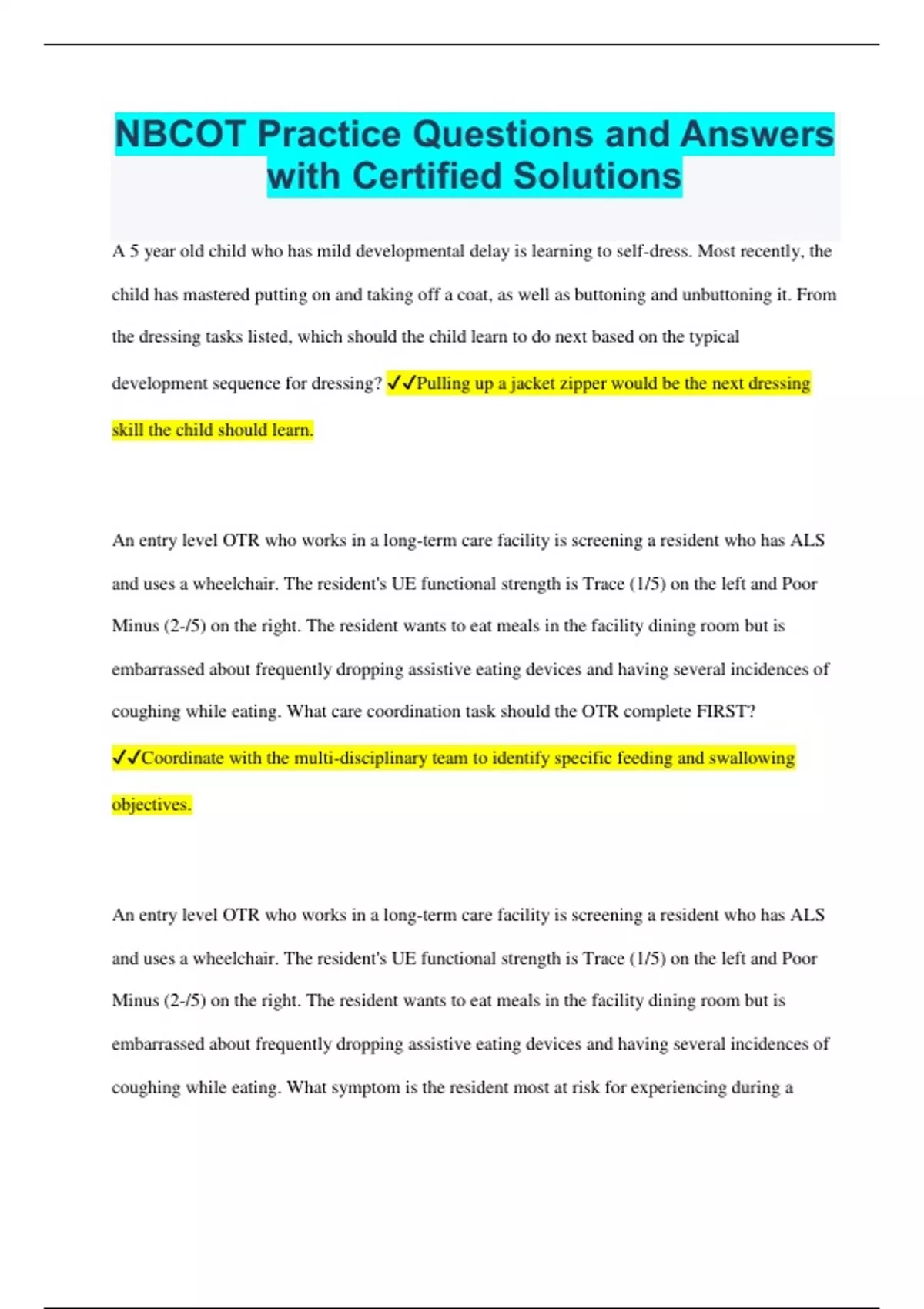 NBCOT Practice Questions and Answers with Certified Solutions A 5 year old child who has mild developmental delay is learning to self-dress. Most recently, the child has mastered putting on and taking off a coat, as well as buttoning and unbuttoning it. From the dressing tasks listed, which should the child learn to do next based on the typical development sequence for dressing? Pulling up a jacket zipper would be the next dressing skill the child should learn. An entry level OTR who works in a long-term care facility is screening a resident who has ALS and uses a wheelchair. The resident's UE functional strength is Trace (1/5) on the left and Poor Minus (2-/5) on the right. The resident wants to eat meals in the facility dining room but is embarrassed about frequently dropping assistive eating devices and having several incidences of coughing while eating. What care coordination task should the OTR complete FIRST? Coordinate with the multi-disciplinary team to identify specific feeding and swallowing objectives. An entry level OTR who works in a long-term care facility is screening a resident who has ALS and uses a wheelchair. The resident's UE functional strength is Trace (1/5) on the left and Poor Minus (2-/5) on the right. The resident wants to eat meals in the facility dining room but is embarrassed about frequently dropping assistive eating devices and having several incidences of coughing while eating. What symptom is the resident most at risk for experiencing during a meal? Variation in voice quality or loss of voice after swallowing, which is a symptom of dysphagia. Which factor is MOST IMPORTANT to determine when considering if the resident would benefit from a mobile arm support? Amount of upper extremity passive joint mobility At a minimum, what information should the OTR document to increase the likelihood of additional authorized visits? Functional problem statements indicating the need for skilled services How should the OTR respond to the client's concerns about splinting? Encourage full participation in daily tasks by collaborating on ways to modify typical daily activities Your patient had a CVA several weeks ago. Which task oriented approach would be most beneficial to include as part of the intervention plan for maximizing the client's physical abilities? Constraint-induced movement therapy is a task-oriented approach to motor acquisition. For a patient who had a CVA several weeks ago, which type of activity should be included as part of the INITIAL intervention to REMEDIATE the client's motor impairment? Weight bearing through the affected upper extremity prior to an activity Which assessment should be included as part of the initial evaluation and can be administered by the COTA? COPM What is contraindicated during phase I of cardiac rehab? Isometric exercises can cause a rapid and sudden increase in blood pressure AOTA Publishes Standards of Practice for Occupational Therapy and the Reference Manual of official Documents of the AOTA. NBCOT Responsible for issues related to certification and certification renewal ACOTE responsible for accreditation of OT education standards in support of the practice standards set forth by the AOTA Negligible Correlation 0 - .2 low correlation .2 - .4 moderate correlation .4 - .6 high correlation .6 - .8 .8 -