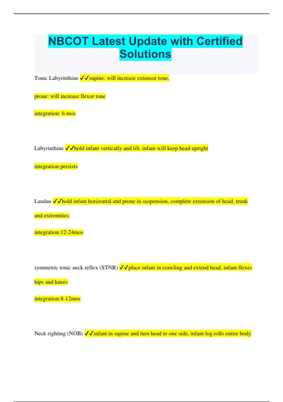NBCOT Latest Update with Certified Solutions Tonic Labyrinthine supine: will increase extensor tone, prone: will increase flexor tone integration: 6 mos Labyrinthine hold infant vertically and tilt, infant will keep head upright integration:persists Landau hold infant horizontal and prone in suspension, complete extension of head, trunk and extremities integration:12-24mos symmetric tonic neck reflex (STNR) place infant in crawling and extend head, infant flexes hips and knees integration:8-12mos Neck righting (NOB) infant in supine and turn head to one side, infant log rolls entire body integration:5 years body on body righting (BOB) infant in supine flex on hip and knee toward chest ,infant segmentally rolls upper trunk to maintain alignment integration:5 years primitive squeeze grasp 4 mos palmar grasp 5 mos radial palmar grasp 6 mos radial digital grasp 8 mos palmar supinate grasp 1-1/2 years writing tool held with fisted hand, wrist flexed and supinated digital pronate grasp 2-3 years, tool held with fingers, wrist in neutral with slight ulnar deviation and forearm pronated static tripod 31/2-4 years. tool held with crude approximation of the thumb, index and middle fingers, ring and little finger slightly flexed, grasped proximally dynamic tripod 4.5 - 6 year olds: Tool held with precise opposition of distal phalanges of thumb index and middle fingers, ring and little finger flexed to form a stable arch, wrist slightly extended glaucoma loss of peripheral vision macular degeneration loss of central vision Kleinert protocol passive flexion/active extension dorsal block splint 0-4 weeks continue splint adjust wrist to neutral tendon gliding light occupation based activities d/c splint 6- 8 weeks strength and work/leisure 8-12 weeks Duran protocol passive flexion and extension Glascow coma scale Severe <8 Moderate 9-12 Minor >13 Brown sequard ipsilateral los off motor, proprioception, discriminative touch, Contralateral loss of painand temperature anterior cord syndrome loss of motor function, pain, pinprick, and temp bilaterally below lesion. proprioception and light touch are preserved posterior cord loss of proprioception. pain temp touch preserved visual agnosia inability to recognize people and objects apraxia inability to carry out specific motor tasks ideational apraxia a lack of knowledge regarding an object's use feeding 5 mos munching occurs consisting of a phasic bite and release of soft cookie feeding 8 mos beginning of mastication with diagonal jaw movement feeding 9 mos lateral tongue movements make mastication effective. drink from cup but jaw not firm feeding 9 mos finger feeds self meals feeding 12 mos dips spoon in twists spoon on way to mouth feeding 12 mos jaw firm, rotary chewing feeding 15 mos scoops food with spoon and brings to mouth feeding 24 mos able to chew most meats and raw vegetables Rancho level I no response, total assistance rancho level II generalized response, total assist responds to painful, repeated auditory, external stimuli. response inconsistent rancho level III localized response, total assist withdraw from painful, turns for auditory, blinks w strong light. inconsistent response to simple verbal commands. response related to stimulus. rancho level IV confused agitated, max assist alert, heightened activity. mood swings, incoherent verbalizations, aggressive behavior, absent short term memory rancho level V confused, inappropriate non agitated, max assist not oriented to person place or time, non-purposeful sustained attn, unable to learn new info, may be able to perform learned tasks rancho level VI confused, appropriate mod assist inconsistently oriented x3, attend to highly familiar tasks up to 30 min w mod A, assistive memory aide, emerging awareness of appropriate response, unaware of impairments rancho level VII automatic, appropriate min assist for ADLs consistently oriented p, p, mod A for time, attend to highly familiar task w min A for 30 min, min sup for new learning w carryover, initiates ADLs can monitor accuracy, overestimates abilities, oppositional/uncooperative rancho level VIII purposeful, appropriate SBA consistently oriented x3, familiar tasks I for 1 hour, recall past and present, assistive memory device, aware of impairment but needs SBA to correct, acknowledges others needs/feelings, low frustration tolerance rancho level IX purposeful appropriate SBA on request I with tasks up to 2 hours, can think about consequences of actions, accurately estimates abilities, can self monitor social appropriateness rancho level X purposeful, appropriate: mod I can multitask, consistently appropriate social behavior, may require more time ACL I automatic actions: automatic motor responses and changes in ANS ACL II postural actions, movement associated with comfort, awareness of large objects, may help with simple tasks ACL III manual actions, beginning to use hands to manipulate objects. limited number of tasks with long terms repetitive training ACL IV goal directed actions, ability to carry simple tasks through to completion. relies on visual cues. can perform established routines but cannot cope with unexpected events ACL V exploratory actions, overt trial and error problem solving. new learning ACL VI planned actions, absence of disability. can think of hypothetical situations and do mental trial and error problem solving. brachial plexus injury flail arm splint radial nerve palsy dynamic wrist, finger, and thumb extension splint median nerve injury opponens splint (thumb spica), c-bar (holds hand in C) ulnar nerve injury static/dynamic splint to position MCPs in flexion combined median ulnar figure of eight or dynamic MCP flexion splint sci 6-7 tenodesis splint carpal tunnel syndrome wrist splint neutral cubital tunnel syndrome elbow splint at 30 degrees flexion deQuervains thumb splint, includes wrist, IP joint free Erb's palsy splint Elbow lock splint Pronator teres syndrome Elbow splint @ 90* with forearm in neutral Right cva l