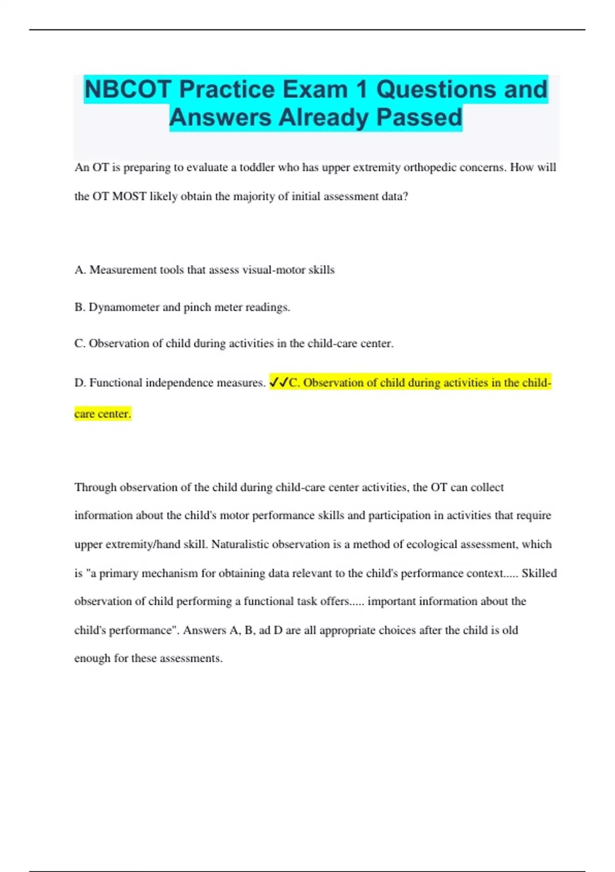 NBCOT Practice Exam 1 Questions and Answers Already Passed An OT is preparing to evaluate a toddler who has upper extremity orthopedic concerns. How will the OT MOST likely obtain the majority of initial assessment data? A. Measurement tools that assess visual-motor skills B. Dynamometer and pinch meter readings. C. Observation of child during activities in the child-care center. D. Functional independence measures. C. Observation of child during activities in the child-care center. Through observation of the child during child-care center activities, the OT can collect information about the child's motor performance skills and participation in activities that require upper extremity/hand skill. Naturalistic observation is a method of ecological assessment, which is "a primary mechanism for obtaining data relevant to the child's performance context..... Skilled observation of child performing a functional task offers..... important information about the child's performance". Answers A, B, ad D are all appropriate choices after the child is old enough for these assessments. During an initial evaluation, the OT suspects that a child has somatodyspraxia. In what area should the OT focus the evaluation? A. Ability to print or write. B. Reading competency. C. Math calculations. D. New motor task planning. D. New motor task planning. "Somatodyspraxia is described as a deficit in learning new motor skills, planning new motor actions, and generalizing motor plans." Inability to print or write (answer A) is termed "dysgraphia." The term "dyslexia" (answer B) means dysfunction in reading. Inability to perform mathematics (answer C) is known as "dyscalculia" An OT working in a long-term care facility needs to evaluate the long-term memory of a resident. Which of the following methods is BEST for evaluating memory or personally experienced events (declarative memory)? A. Show the person a series of objects and ask him to recall the objects within 60 seconds. B. Ask the individual how he spent New Year's/ C. Have the individual state the place, date, and time. D. Ask the client to remember to bring a specific item to the next therapy session B Ask the individual how he spent New Year's "Declarative memory is one aspect of long term memory and includes conscious memory for events, knowledge or facts". It is commonly assessed through verbal interviews and informal testing such as asking a question about an individual's recall of personal events (answer B). Working memory refers to "the temporary storage of inforamtion while one is working with it or attending to it" (answer A). "Prospective memory involves the ability to remember intentions or activities that will be required in the future" (answer D). Knowing the date, place, and time is indicative of orientation (answer C). A child avoids playground equipment that requires her feet to be off the ground. What does this behavior MOST likely indicate? A. Difficulty modulating proprioception. B. Somatodyspraxia C. Gravitational insecurity D. Bilateral integration/sequencing deficit. C. Gravitational insecurity. Gravitational insecurity is described as "fear response to movement". The child easily experiences a fear of falling and prefers to keep her feet firmly on the ground. Tactile defensiveness (answer A) is a term used to describe discomfort