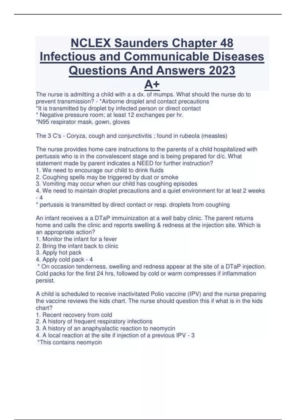 NCLEX Saunders Chapter 48 Infectious and Communicable Diseases Questions And Answers 2023 A+ The nurse is admitting a child with a a dx. of mumps. What should the nurse do to prevent transmission? - *Airborne droplet and contact precautions *It is transmitted by droplet by infected person or direct contact * Negative pressure room; at least 12 exchanges per hr. *N95 respirator mask, gown, gloves The 3 C's - Coryza, cough and conjunctivitis ; found in rubeola (measles) The nurse provides home care instructions to the parents of a child hospitalized with pertussis who is in the convalescent stage and is being prepared for d/c. What statement made by parent indicates a NEED for further instruction? 1. We need to encourage our child to drink fluids 2. Coughing spells may be triggered by dust or smoke 3. Vomiting may occur when our child has coughing episodes 4. We need to maintain droplet precautions and a quiet environment for at leat 2 weeks - 4 * pertussis is transmitted by direct contact or resp. droplets from coughing An infant receives a a DTaP immuinization at a well baby clinic. The parent returns home and calls the clinic and reports swelling & redness at the injection site. Which is an appropriate action? 1. Monitor the infant for a fever 2. Bring the infant back to clinic 3. Apply hot pack 4. Apply cold pack - 4 * On occasion tenderness, swelling and redness appear at the site of a DTaP injection. Cold packs for the first 24 hrs, followed by cold or warm compresses if inflammation persist. A child is scheduled to receive inactivitated Polio vaccine (IPV) and the nurse preparing the vaccine reviews the kids chart. The nurse should question this if what is in the kids chart? 1. Recent recovery from cold 2. A history of frequent respiratory infections 3. A history of an anaphyalactic reaction to neomycin 4. A local reaction at the site if injection of a previous IPV - 3 *This contains neomycin A kid is receiving a series of Hep B vaccines and arrives for a second dose. Before giving the nurse should ask the kid and parent about a history of a severe allergic reaction to what?...