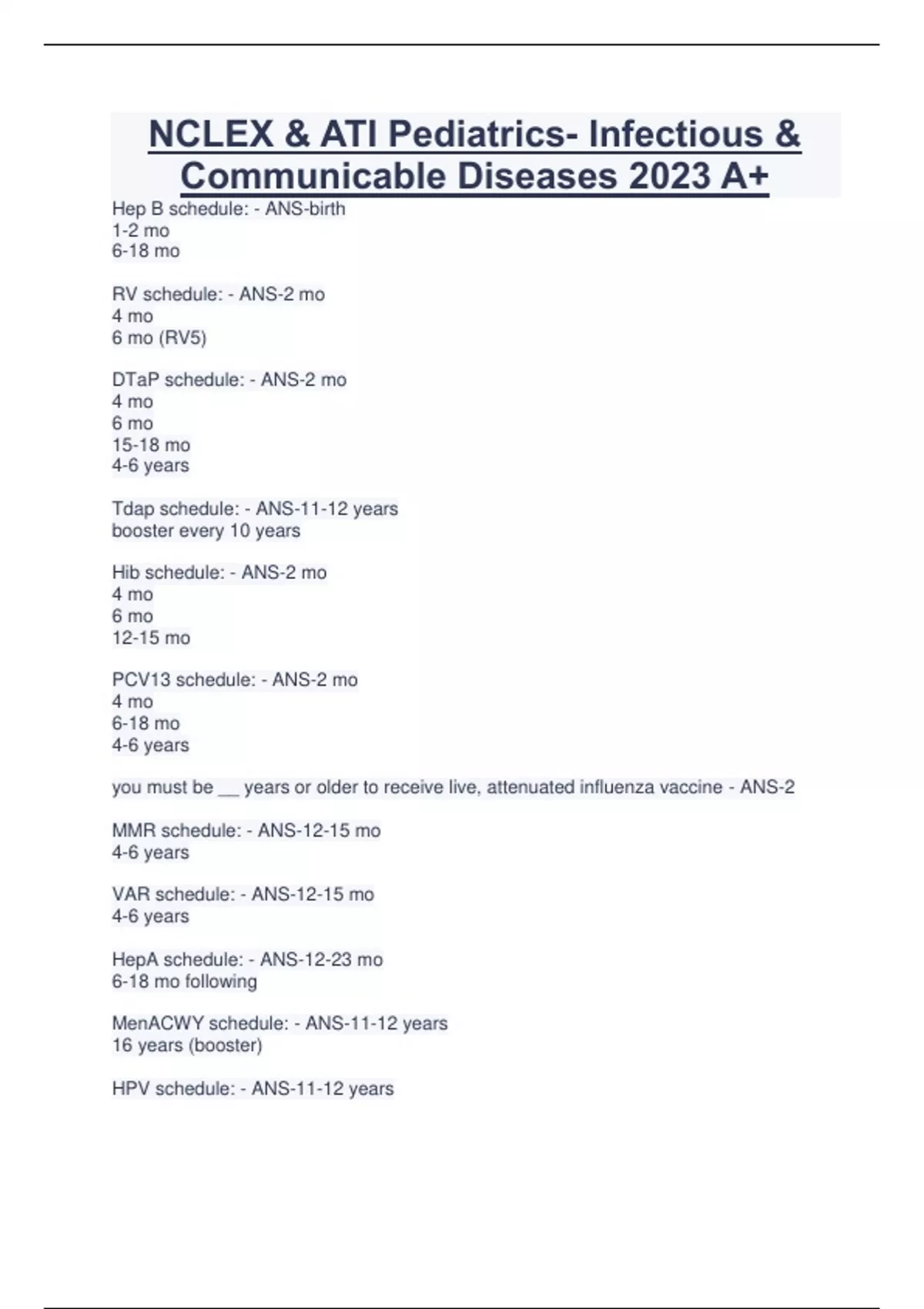 NCLEX & ATI Pediatrics- Infectious & Communicable Diseases 2023 A+ Hep B schedule: - ANS-birth 1-2 mo 6-18 mo RV schedule: - ANS-2 mo 4 mo 6 mo (RV5) DTaP schedule: - ANS-2 mo 4 mo 6 mo 15-18 mo 4-6 years Tdap schedule: - ANS-11-12 years booster every 10 years Hib schedule: - ANS-2 mo 4 mo 6 mo 12-15 mo PCV13 schedule: - ANS-2 mo 4 mo 6-18 mo 4-6 years you must be __ years or older to receive live, attenuated influenza vaccine - ANS-2 MMR schedule: - ANS-12-15 mo 4-6 years VAR schedule: - ANS-12-15 mo 4-6 years HepA schedule: - ANS-12-23 mo 6-18 mo following MenACWY schedule: - ANS-11-12 years 16 years (booster) HPV schedule: - ANS-11-12 years 1-2 mo after first dose 24 weeks after first dose contraindications with DTaP: - ANS-occurrence of encephalopathy within 7 days following prior doses of the vaccine contraindications with RV: - ANS-hx of intussception or severe combined immunodeficiency contraindications with IPV: - ANS-anaphylactic reaction neomycin, streptomycin, or polymyxin B contraindications with MMR: - ANS-pregnancy contraindications with VAR: - ANS-pregnancy anaphylactic reaction to gelatin or neomycin taking corticosteroids for 2 weeks or longer contraindications with PCV13: - ANS-anaphylactic reaction to any vaccine containing diphtheria toxoid instruct parents to avoid admin aspirin to the child to treat fever or local reaction following admin of a live virus vaccine due to the risk of developing _______ syndrome - ANS-Reye a nurse is preparing to admin immunizations to a 4 mo old infant. which of the following is an appropriate action for the nurse to take in providing atraumatic care? - administer 81 mg of aspirin - use the z-track method when injecting - ask the parents to leave the room during the injection - provide sucrose solution on the pacifier - ANS-- provide sucrose solution on the pacifier a nurse is planning to admin recommended immunizations to a 2 mo old infant. which of the following vaccines should the nurse plan to give? - RV - DTaP - Hib - HepA - PCV13 - IPV - ANS-- RV - DTaP - Hib - PCV13 - IPV Continues...